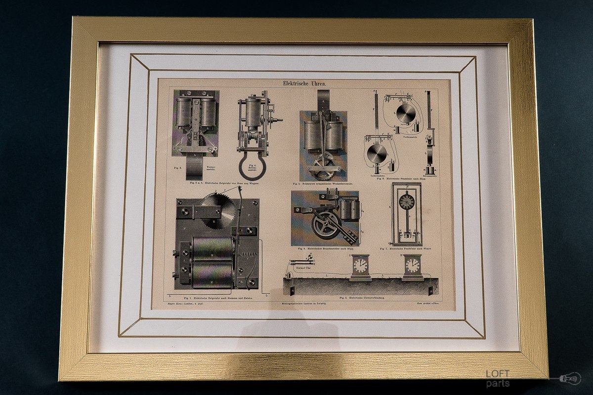 Grafika ''Zegary elektryczne''. Dokument oryginalny, oprawiony w złotą ramkę. Przedstawia rysunki różnego rodzaju zegarów elektrycznych. Bardzo dobrze prezentuje się na ceglanych i betonowych ścianach a tematyka wprost nawiązuje do industrialnego wzornictwa. Grafika posiada certyfikat (pieczęć) niemieckiego antykwariatu.