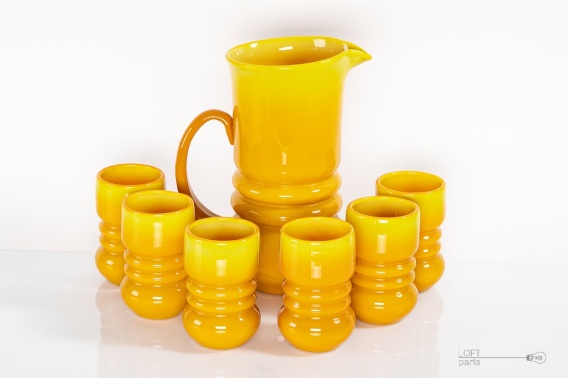 Pomarańczowo-żółty zestaw do zimnych napojów zaprojektowany przez Lucynę Pijaczewską. Wyprodukowany w Hucie Szkła Artystycznego Barbara. Zestaw składa się z dzbanka i sześciu szklanek.