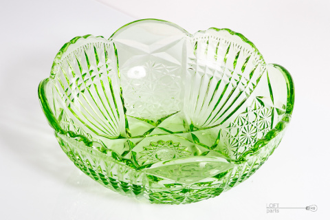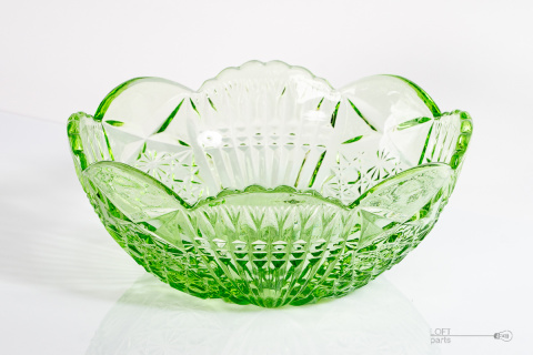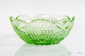A green bowl produced in the Ząbkowice Household Glassworks. In the catalogue of the glassworks, it is numbered 1235/V.