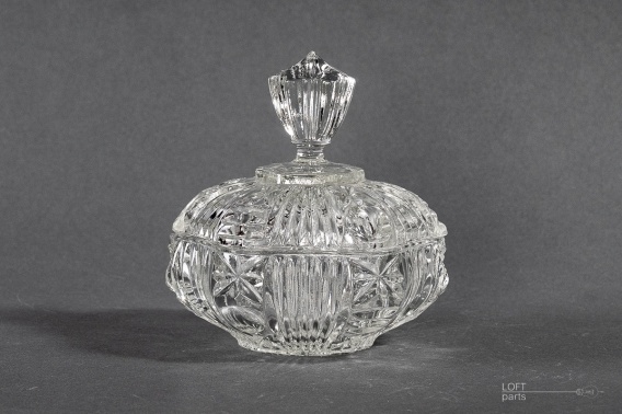 A colourless chocolate box produced in the Ząbkowice Household Glassworks. In the catalogue of the glassworks, it is numbered 2046. The chocolate box has damage on the edge (visible in the photo).