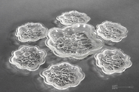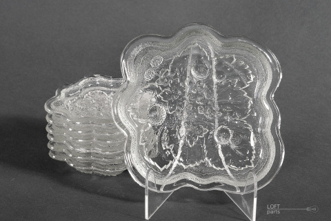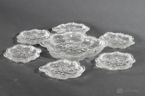 A colourless dessert set consisting of a platter and six plates produced in the Ząbkowice Household Glassworks. In the catalogue of the glassworks, it is numbered 1020.