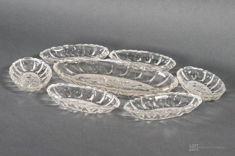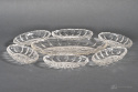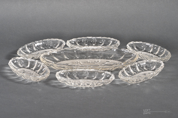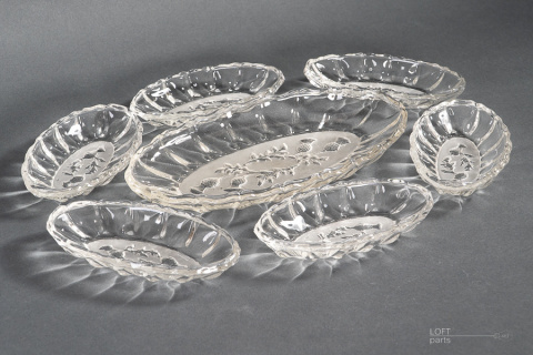 A set of 6+1 colourless platters of herring ''Thistles'' produced in the Ząbkowice Household Glassworks.In the catalogue of the glassworks they are numbered 1279.
