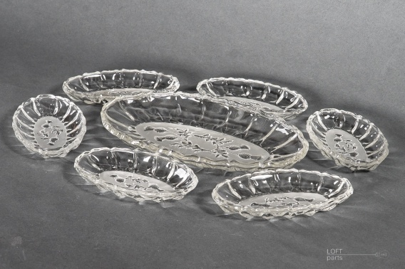 Komplet 6+1 bezbarwnych paterek śledziówek ''Osty'' wyprodukowanych w Hucie Szkła Gospodarczego Ząbkowice. W katalogu huty noszą numer 1279.