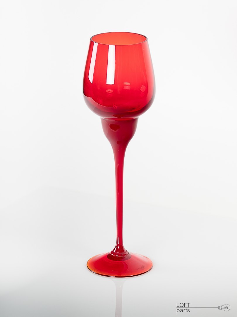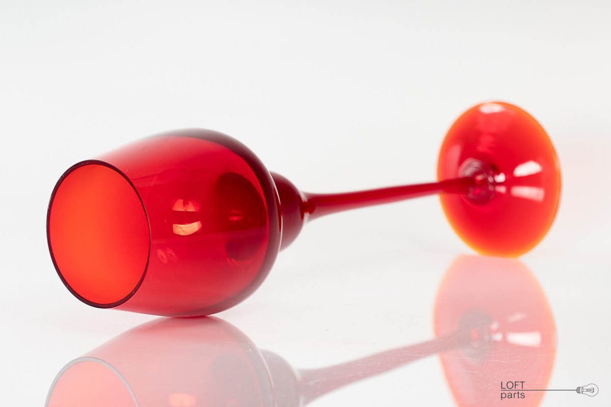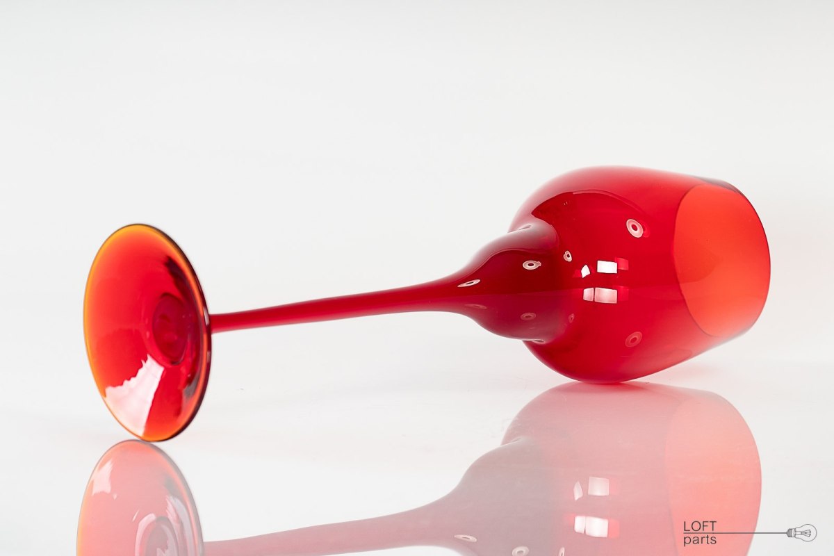 Czerwony kielich zaprojektowany przez Ludwika Fiedorowicza. Wyprodukowany w Hucie Szkła Gospodarczego Ząbkowice.