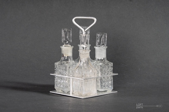 Zestaw przyprawników w aluminiowej podstawie/tacce. Zestaw składa się z czterech buteleczek na płynne przyprawy. Wyprodukowane w Hucie Szkła Gospodarczego Ząbkowice. Trzy korki do buteleczek pochodzą z innego wzorniczo zestawu.