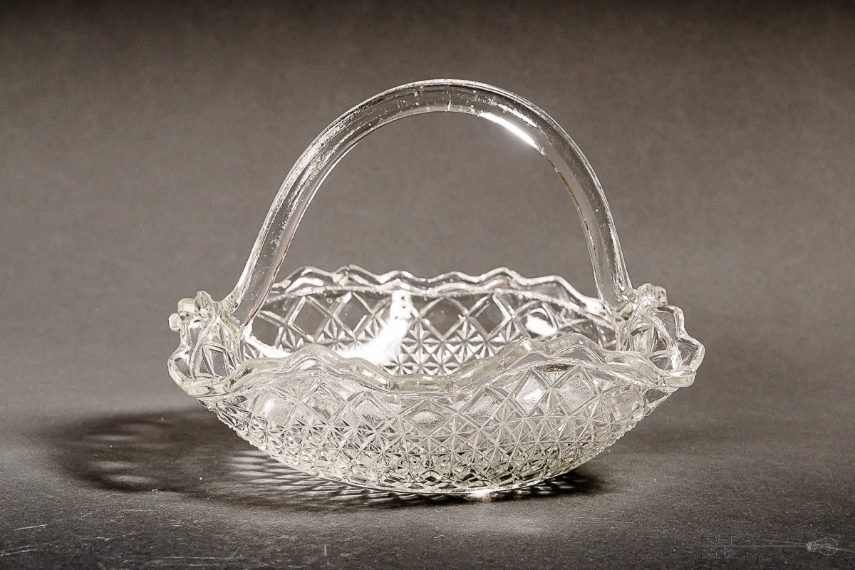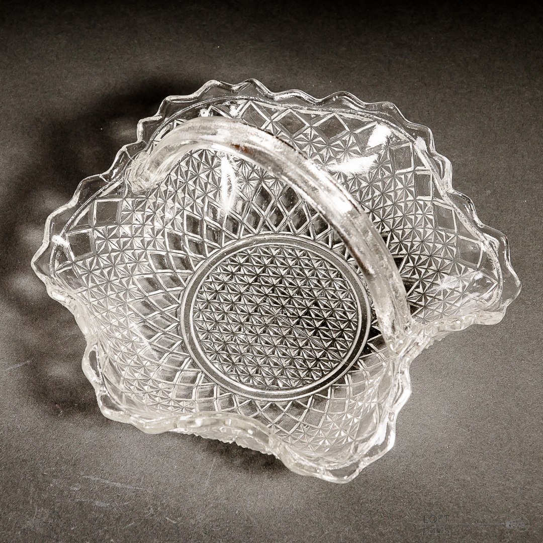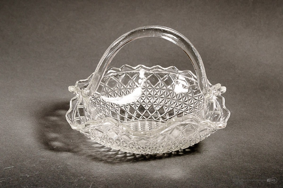 Bezbarwny koszyczek z geometrycznym wzorem na tacy. Niestety nie znam jego pochodzenia.