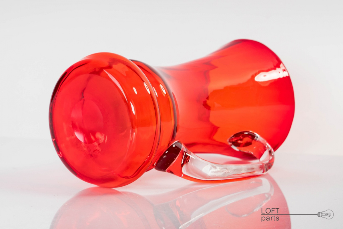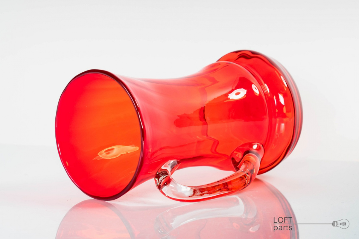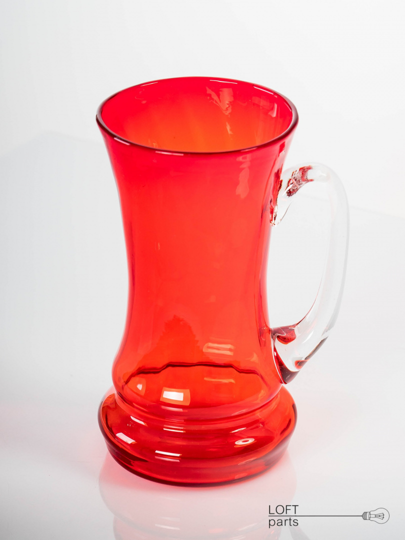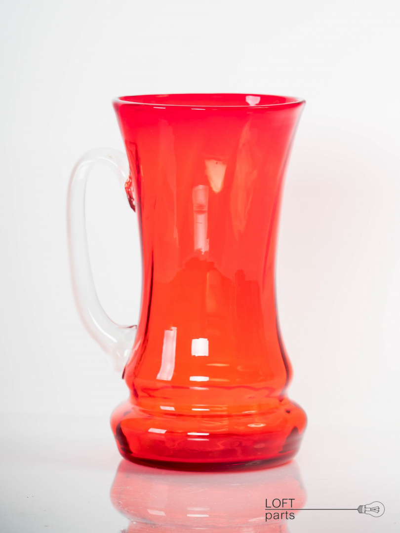 A red mug designed by Ludwik Fiedorowicz. Manufactured in the Ząbkowice Household Glass Factory.