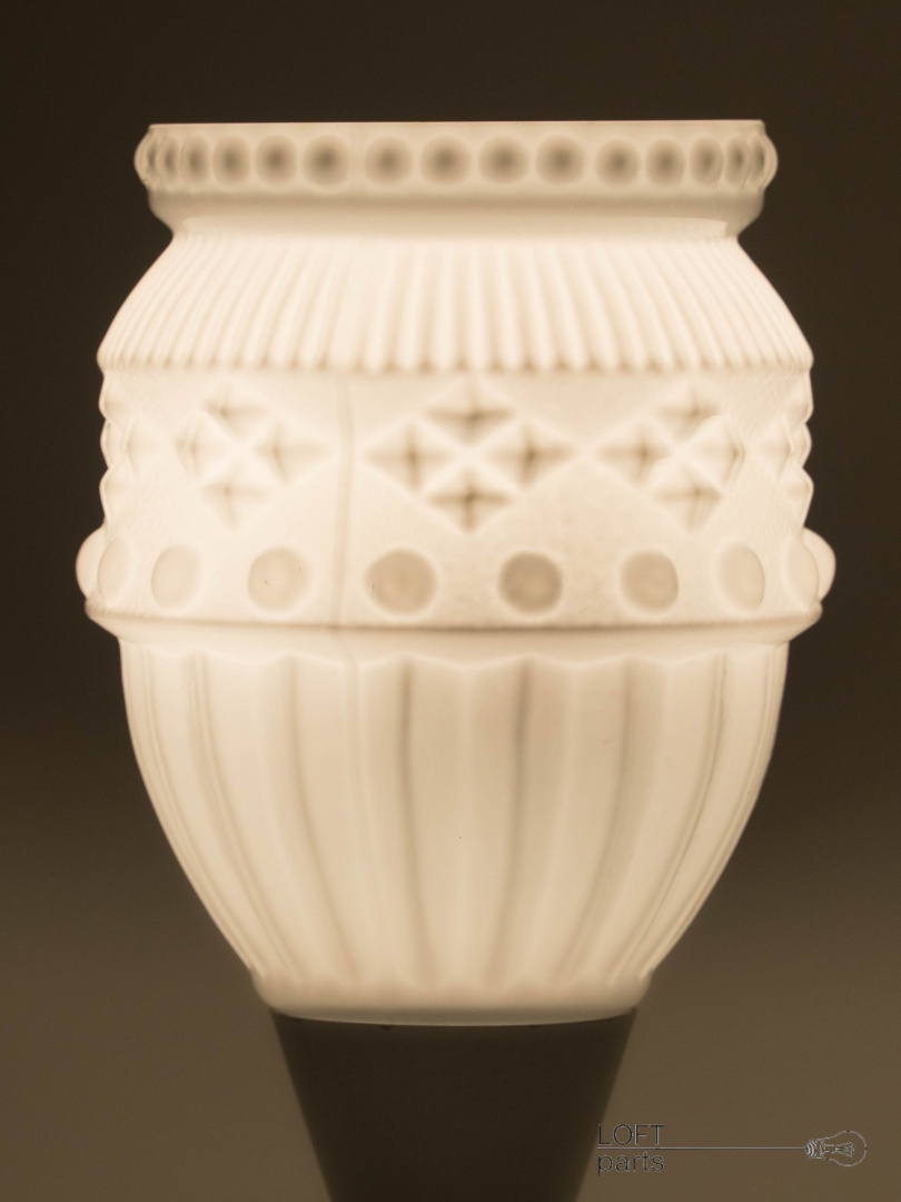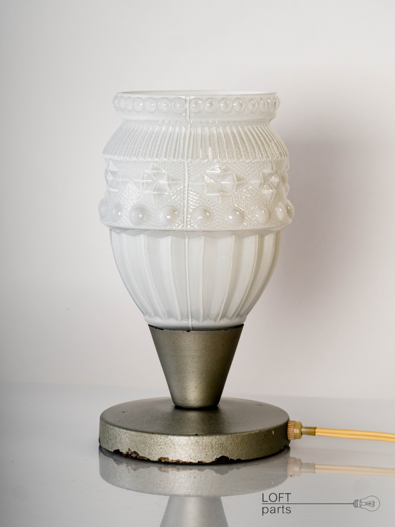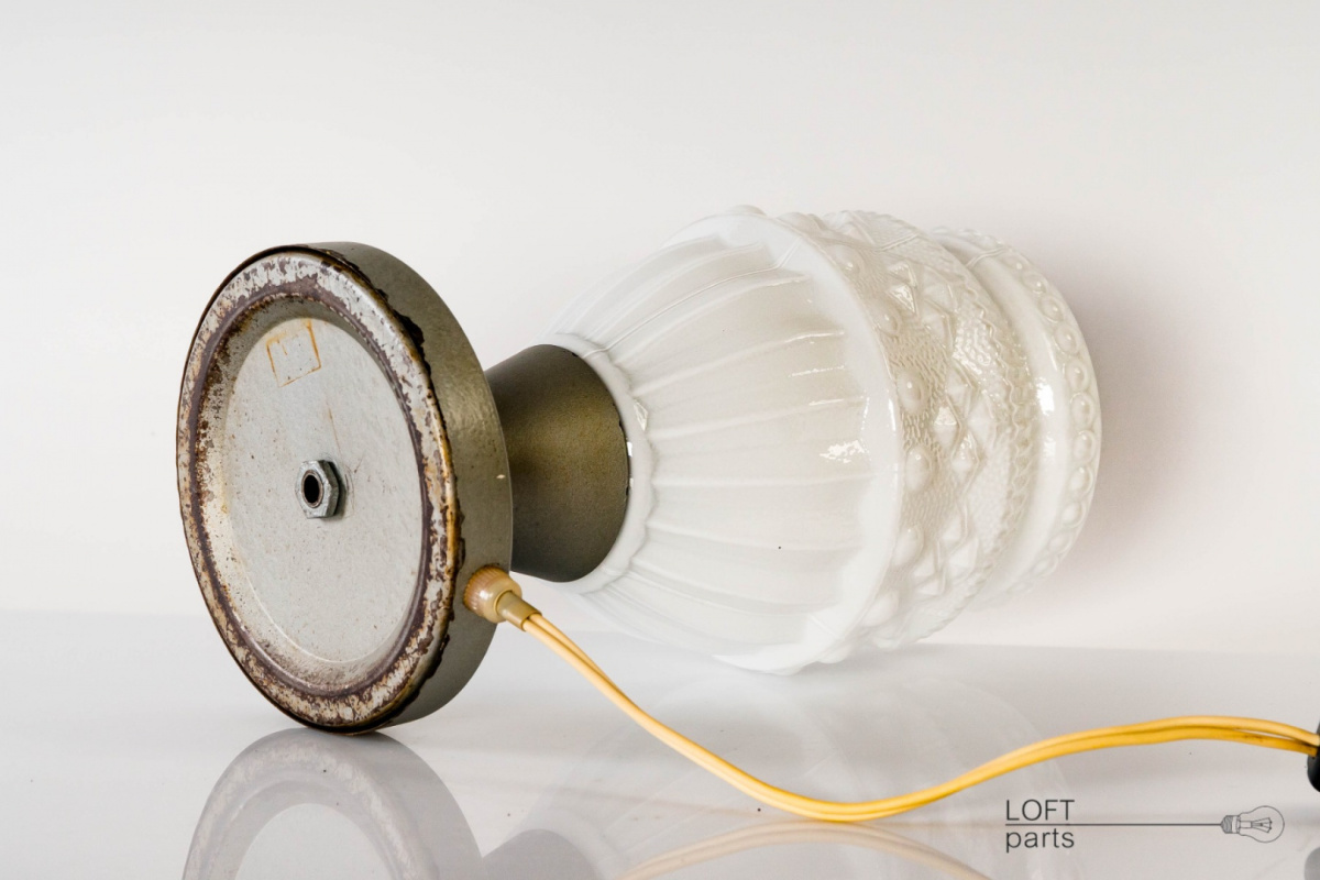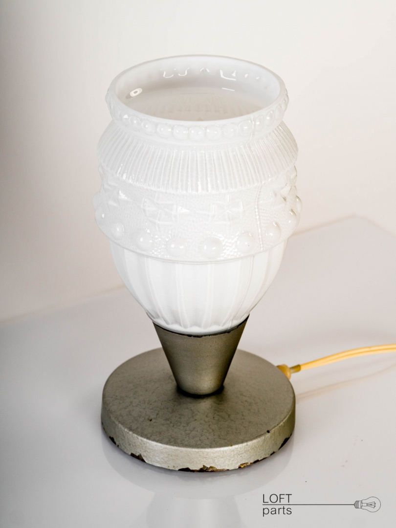 Stara polska lampa. Podstawa metalowa pokryta lakierem młotkowym. Klosz biały produkcji HSO ''Nysa'' w Pieńsku.