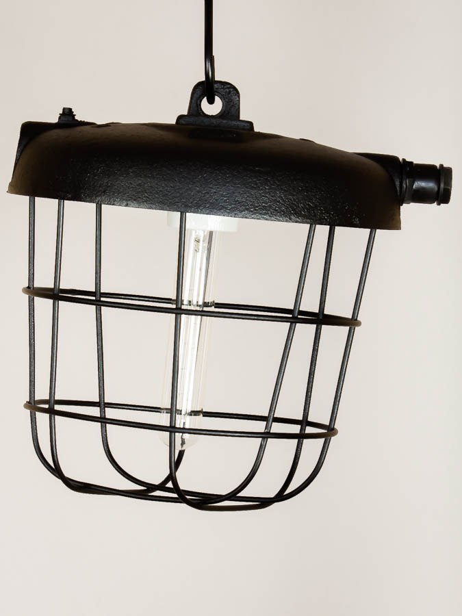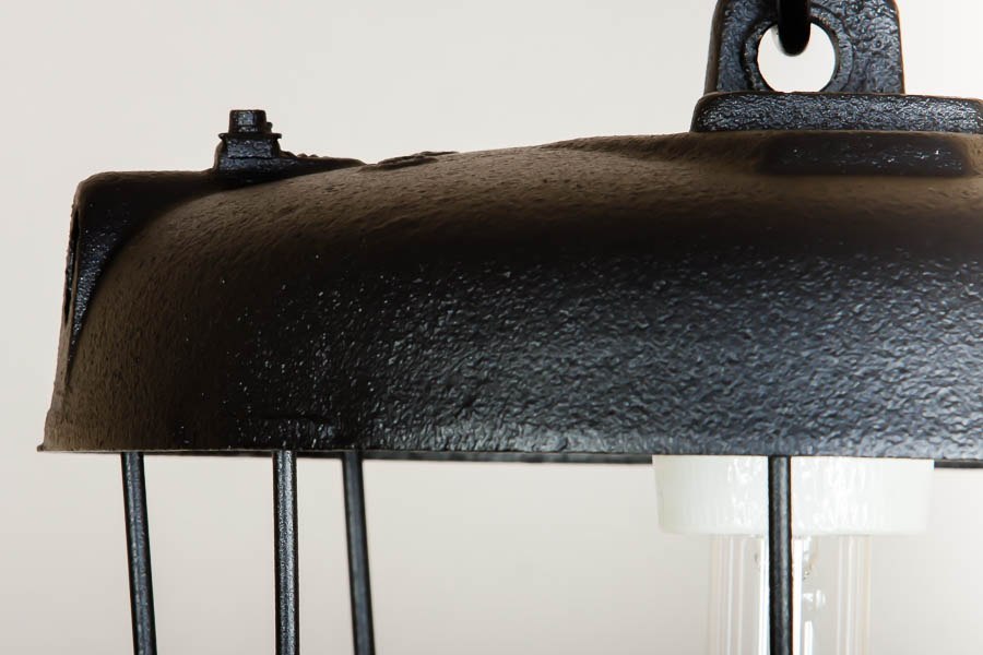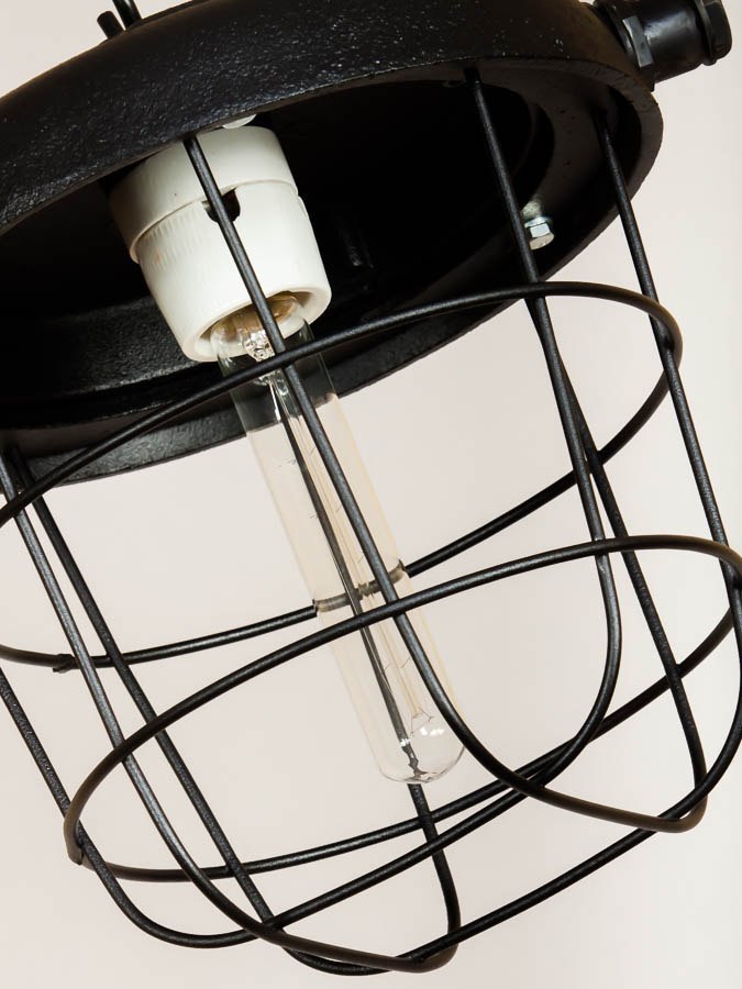 Cast iron pendant lamp type OS-200 in black. The lamp does not have a glass lampshade. Equipped with an Edison bulb