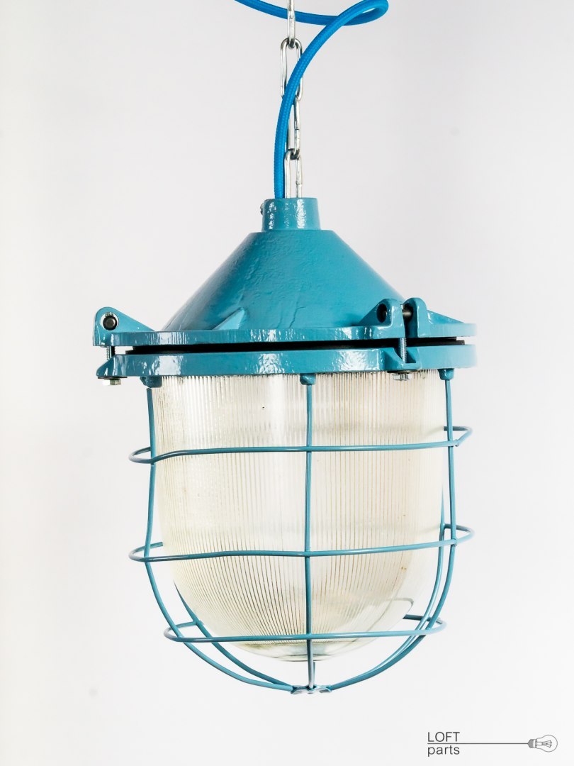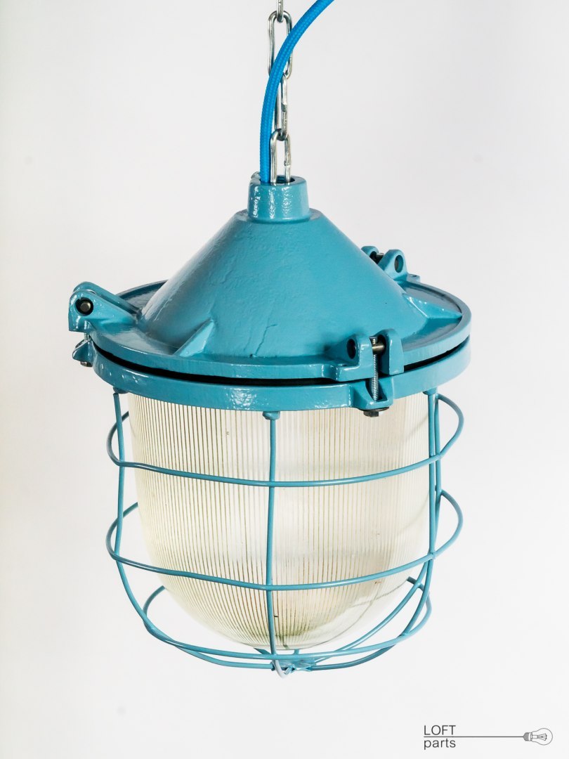 Żeliwna lampa wisząca w kolorze niebieskim.