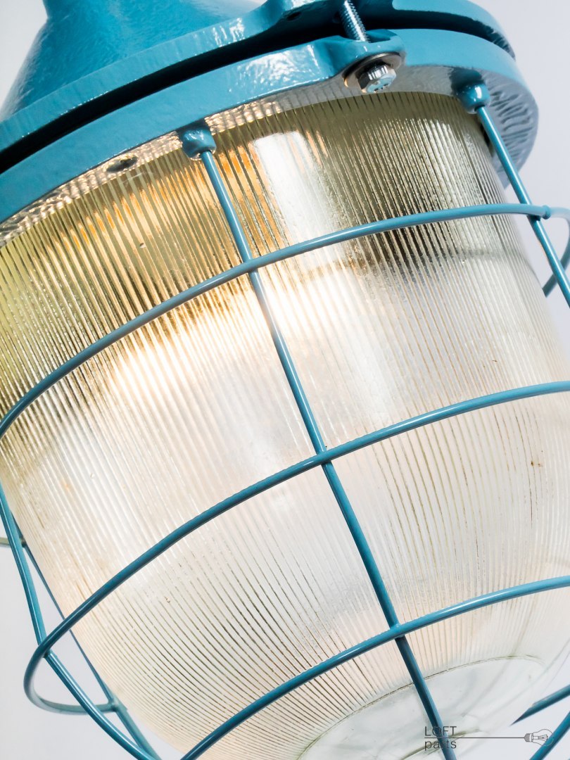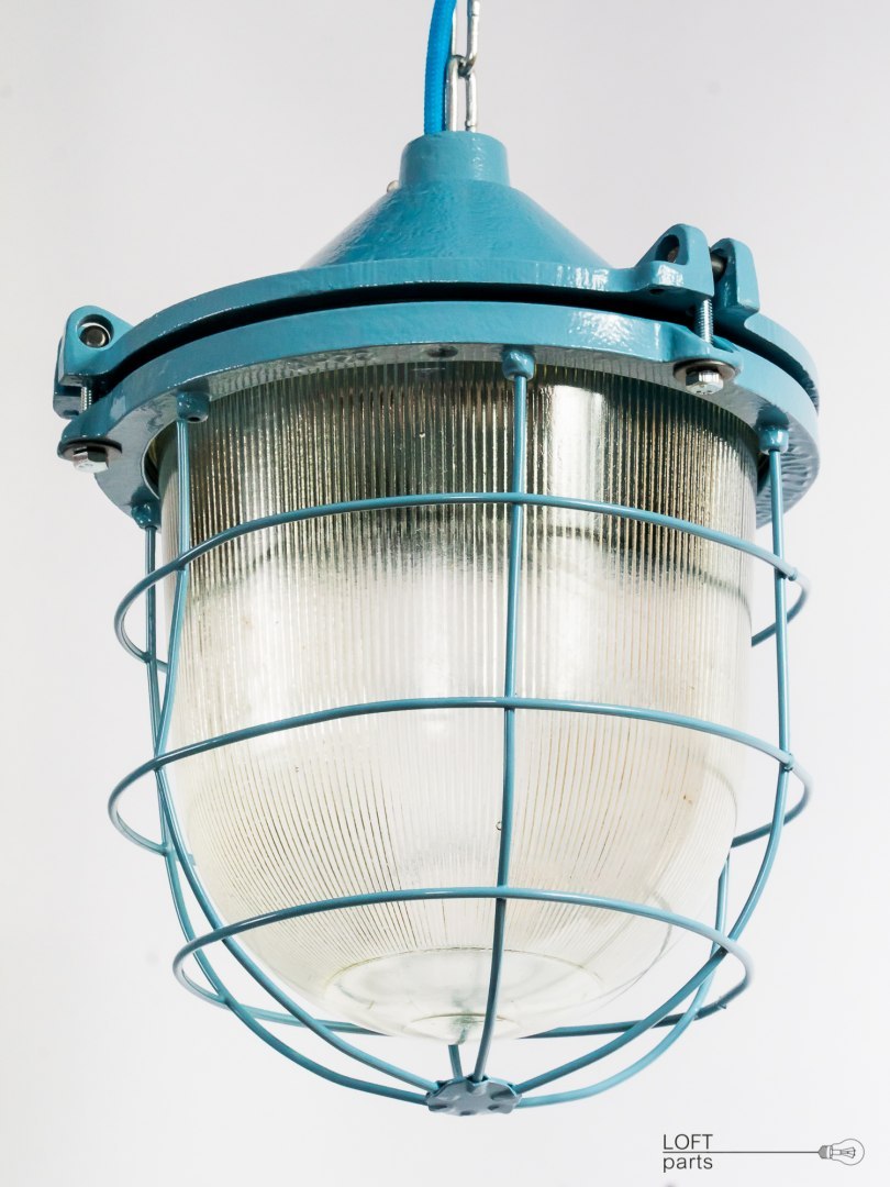 Żeliwna lampa wisząca w kolorze niebieskim. Masywna, z ciekawym, rzadko występującym, ryflowanym kloszem. Wyposażona w żarówkę.