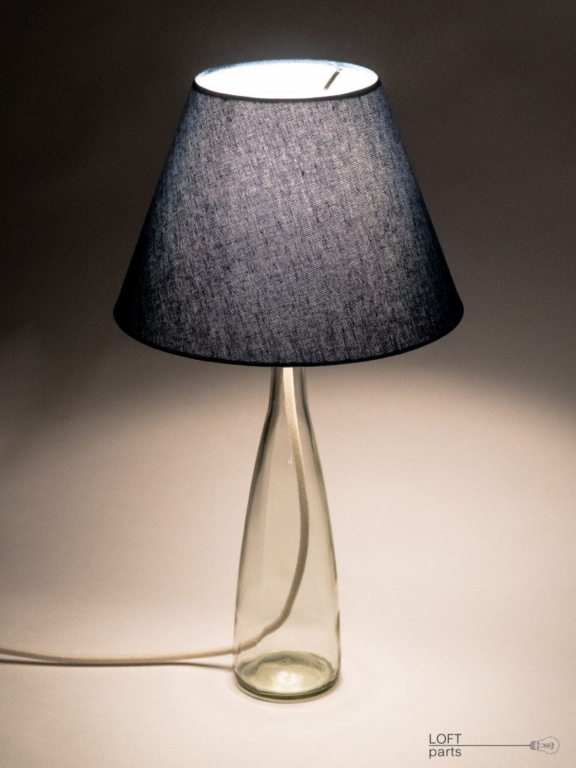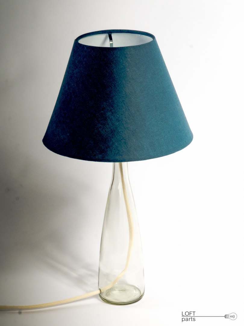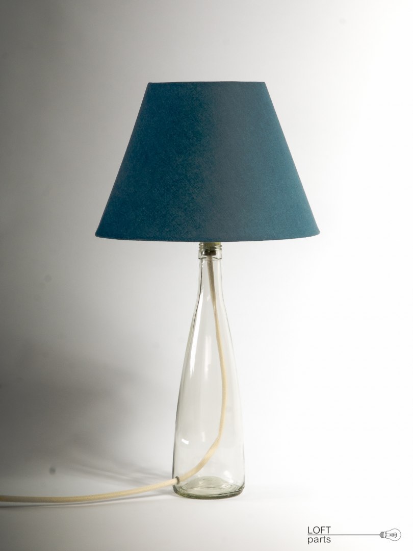 Lampa z niebieskim abażurem, której podstawę stanowi bezbarwna butelka po winie. Starannie wykonana i wyposażona w przewód zasilający w bawełnianym oplocie. lampa posiada żarówkę LED dająca ciepłe, miłe światło.