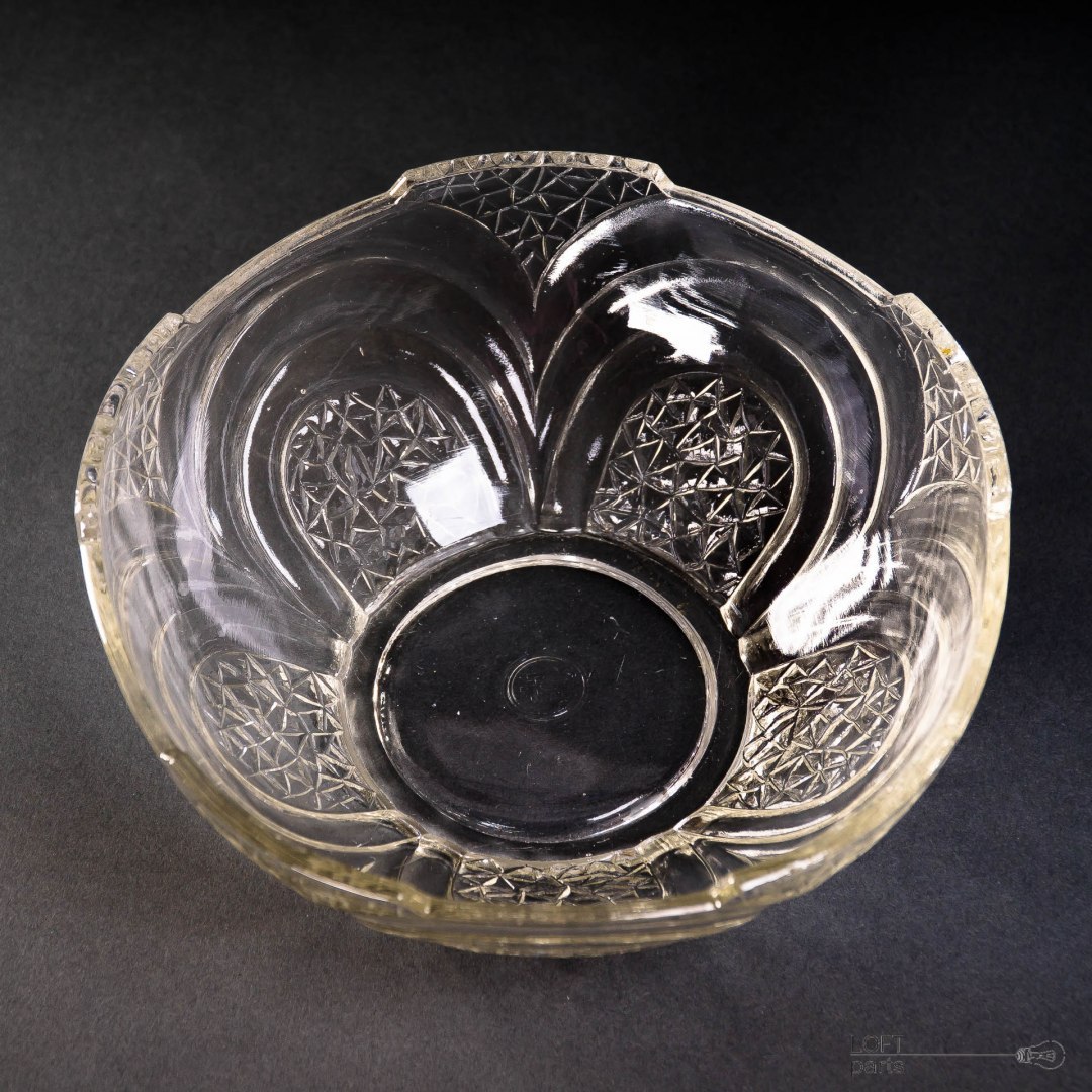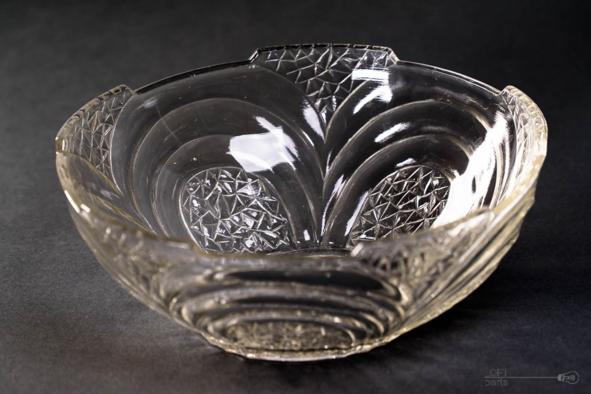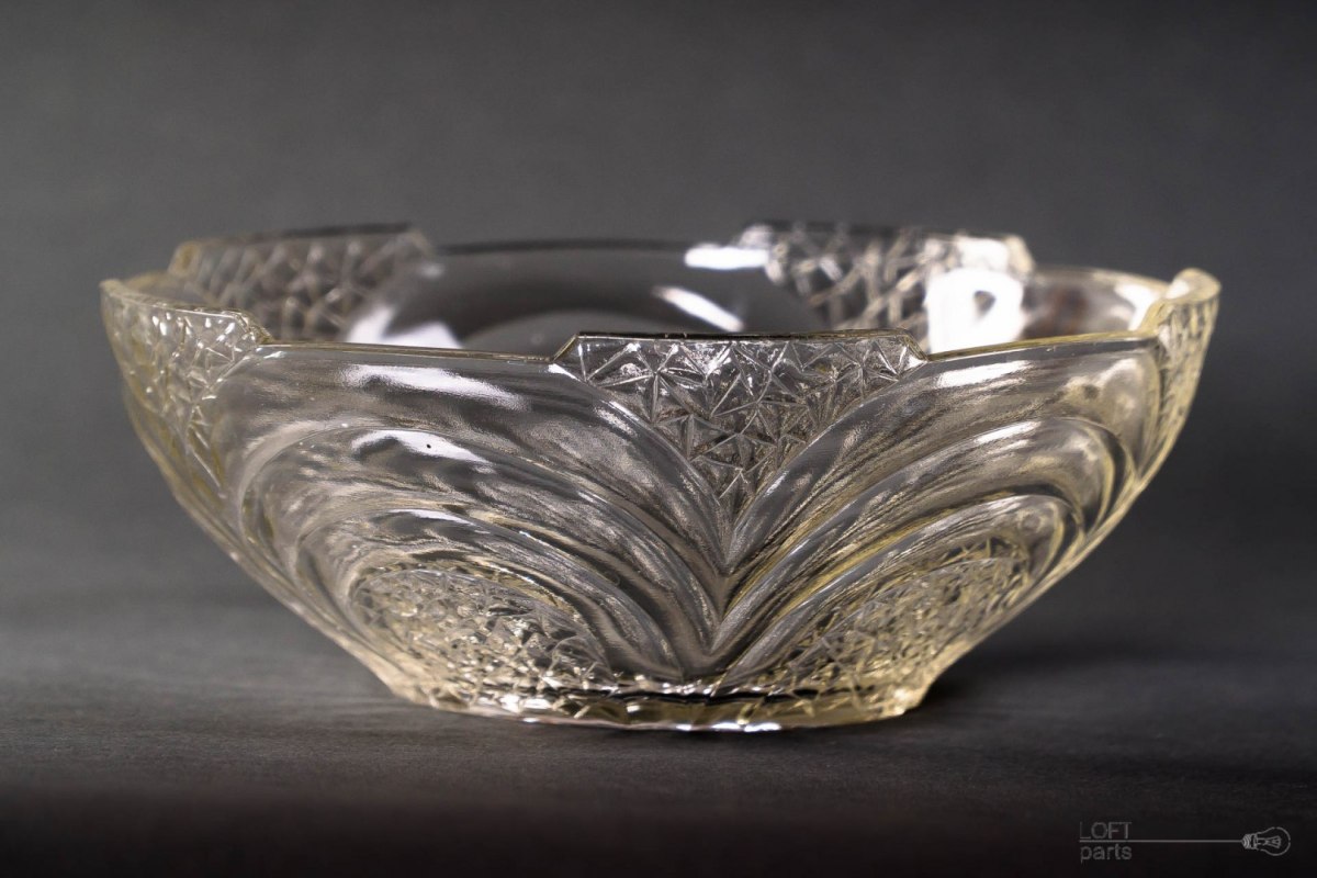 Bezbarwna misa w stylu Art Deco wyprodukowana w Hucie Szkła Gospodarczego Hortensja.