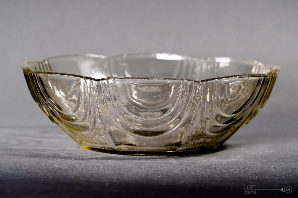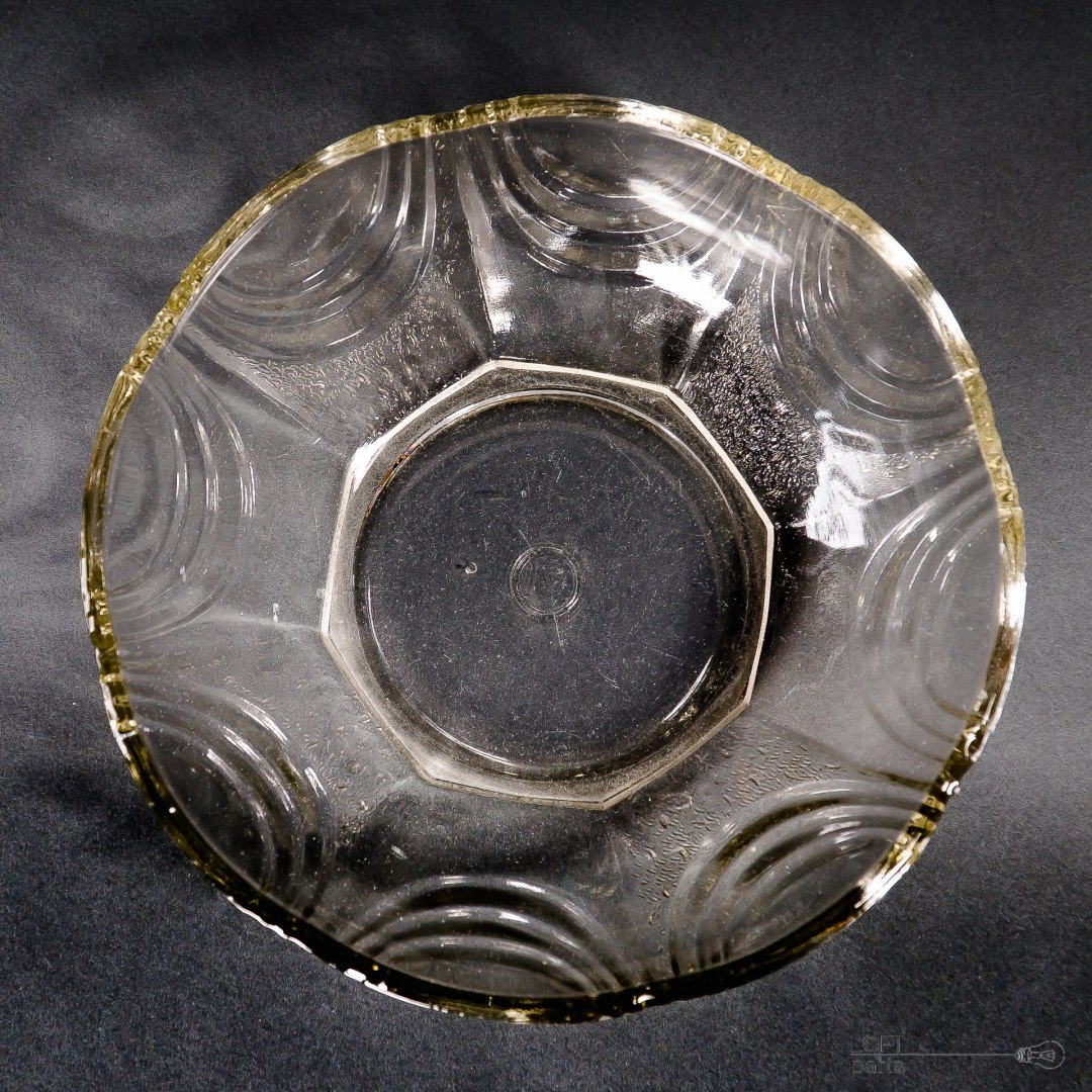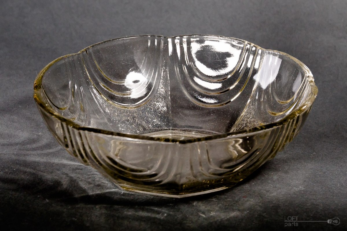 Bezbarwna misa wyprodukowana w Hucie Szkła Gospodarczego Hortensja. W katalogu huty nosi numer 502.