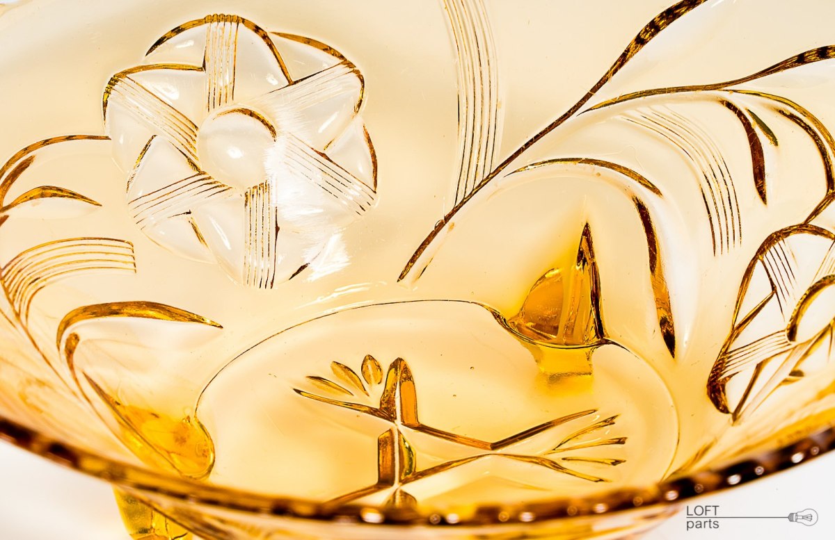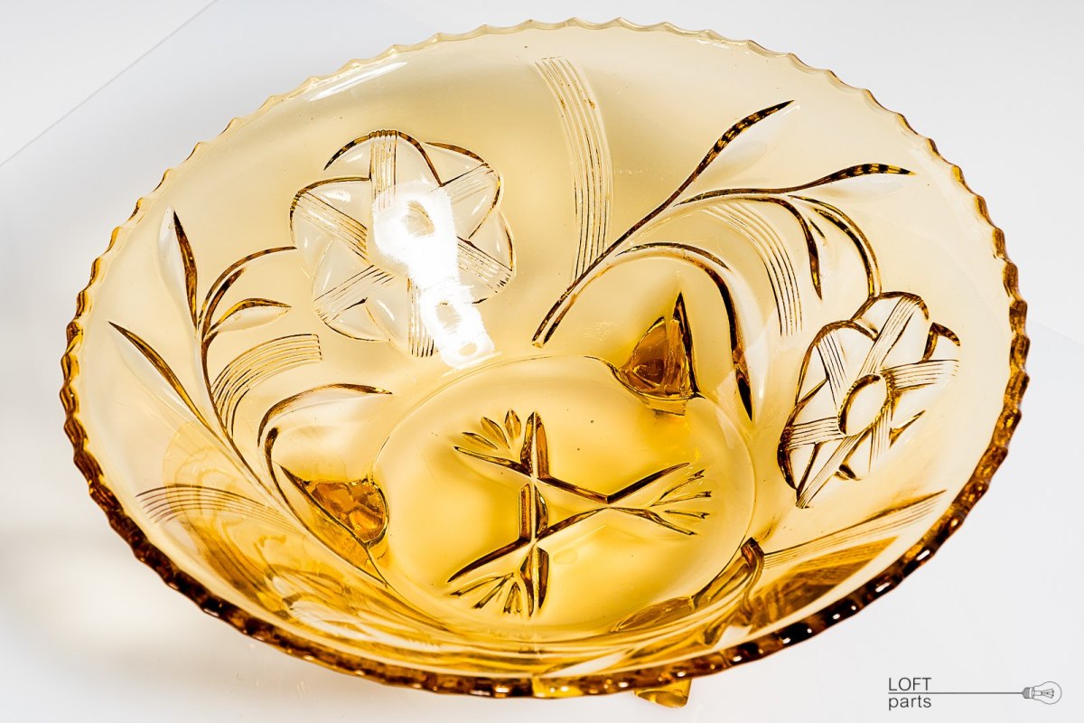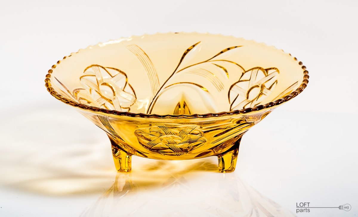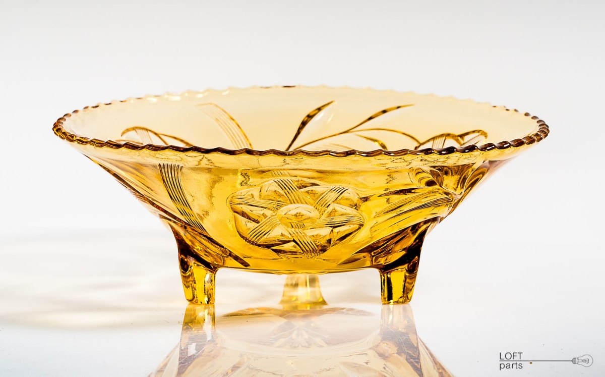 Miodowa patera/owocarka na nóżkach wyprodukowana w Bernsdorf Glashute. W katalogu huty nosi numer 392.