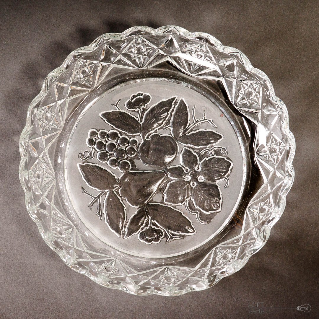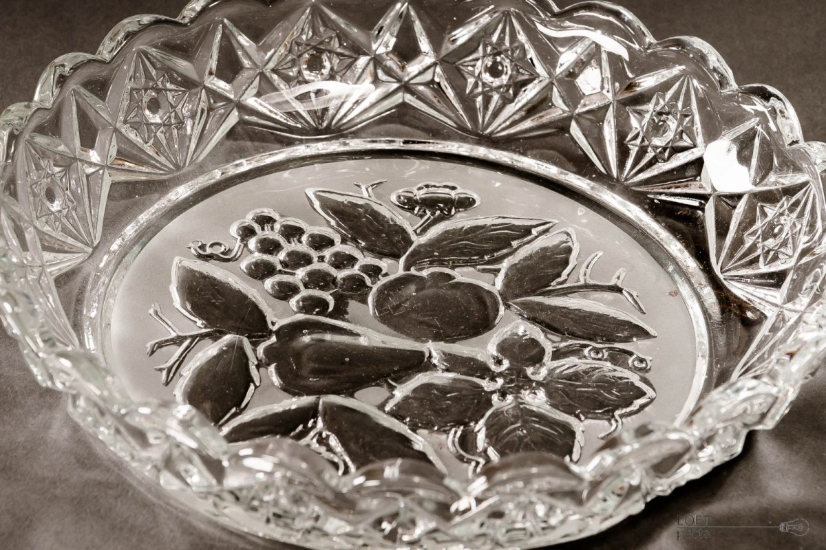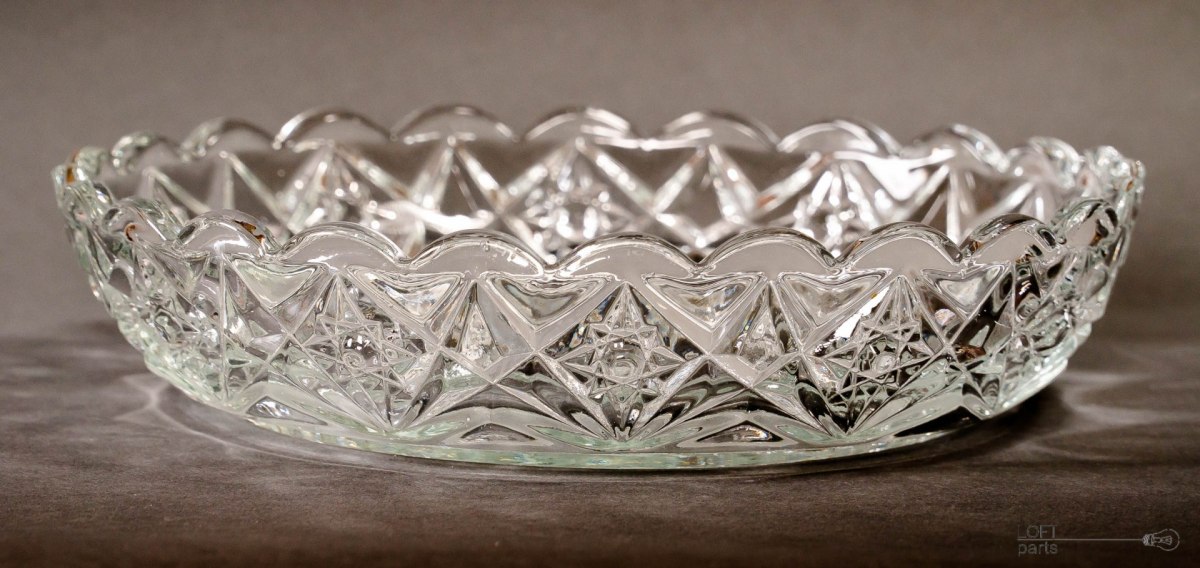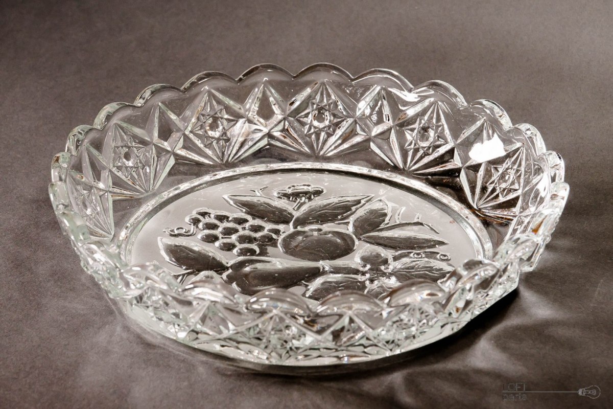 Bezbarwna duża patera wyprodukowana w Hucie Szkła Gospodarczego Hortensja.