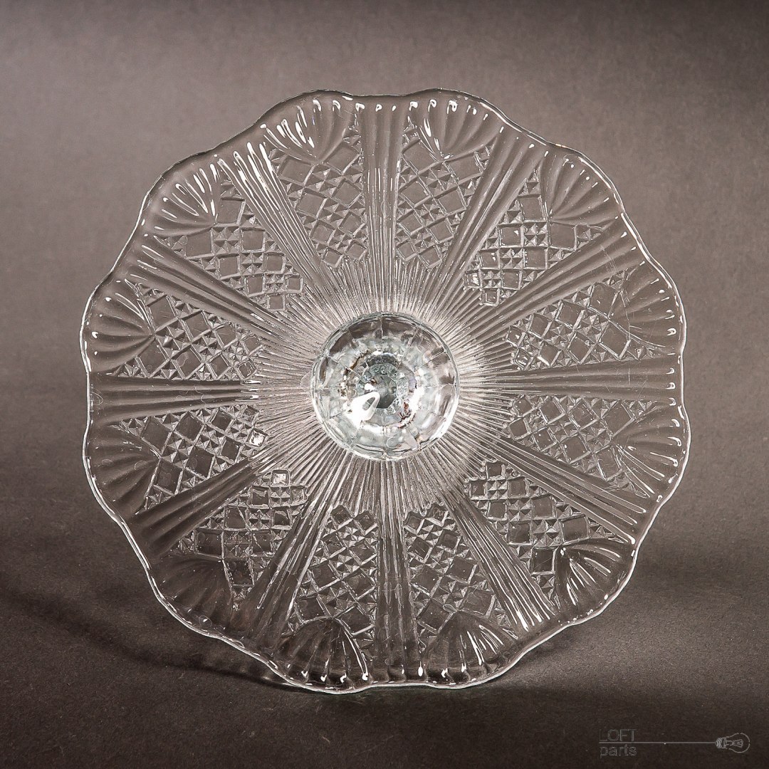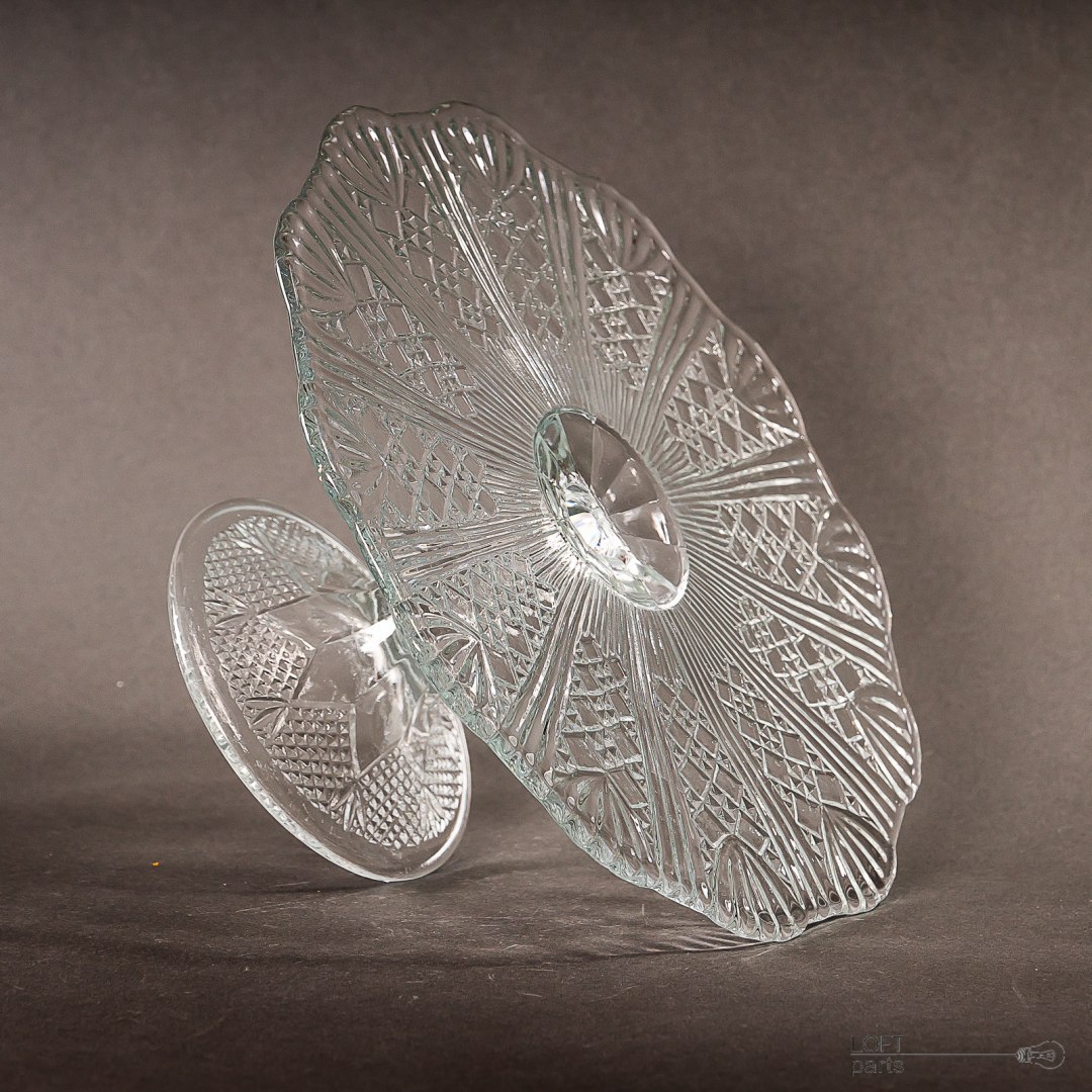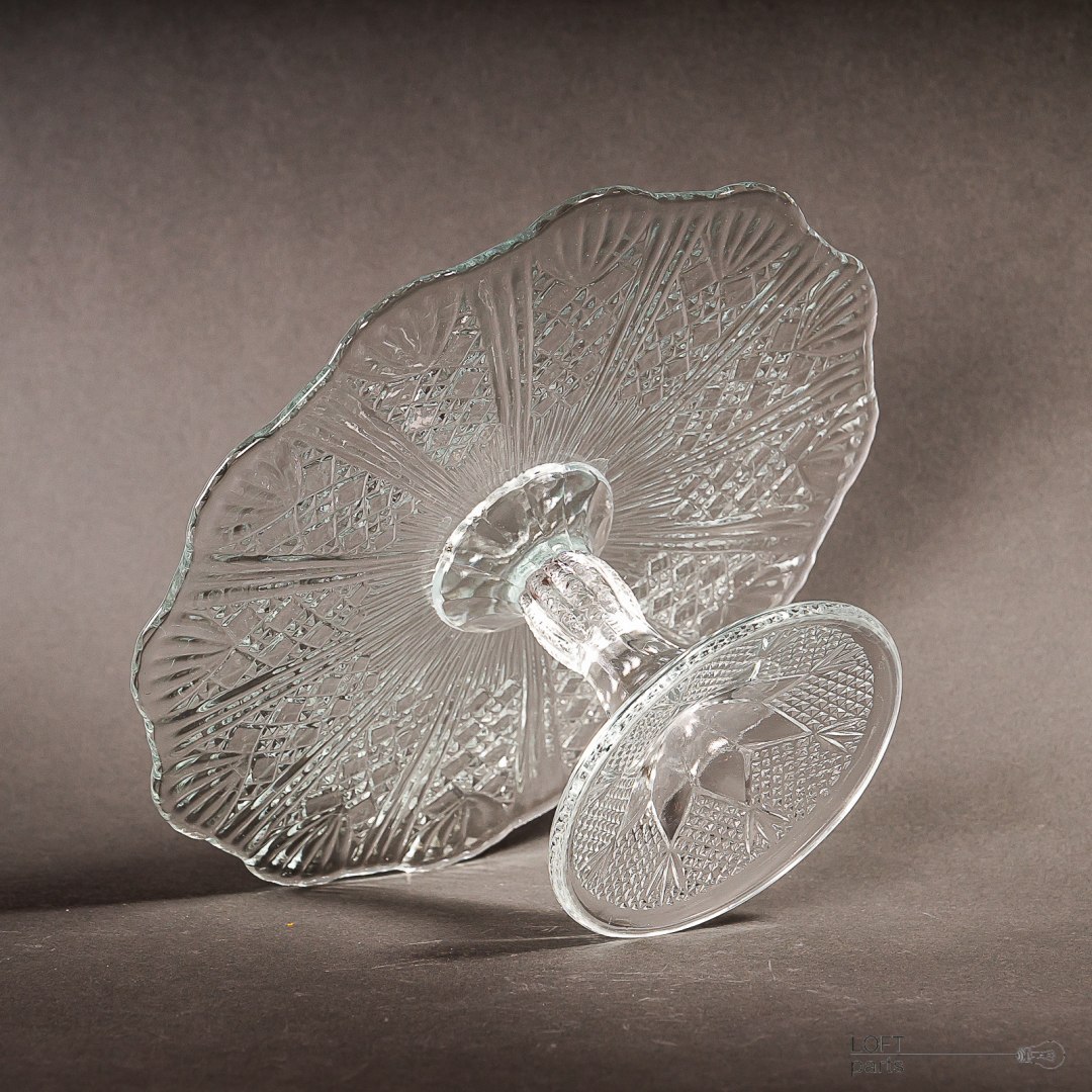 Bezbarwna patera/tortownica pochodząca z Huty Szkła Gospodarczego Ząbkowice. W katalogu huty nosi numer 320.