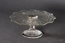 Rozalinowa patera/owocarka wyprodukowana w Hucie Szkła Gospodarczego Ząbkowice. W katalogu huty nosi numer 320.