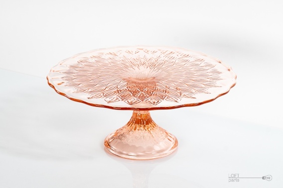 Rozalinowa patera/tortownica ''Migdały'' zaprojektowana przez Erykę Trzewik Drost. Wyprodukowana w Hucie Szkła Gospodarczego Ząbkowice.