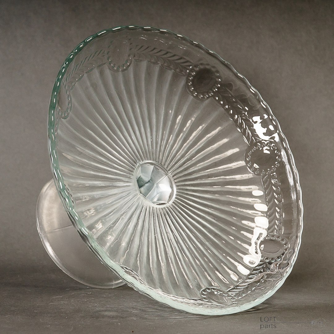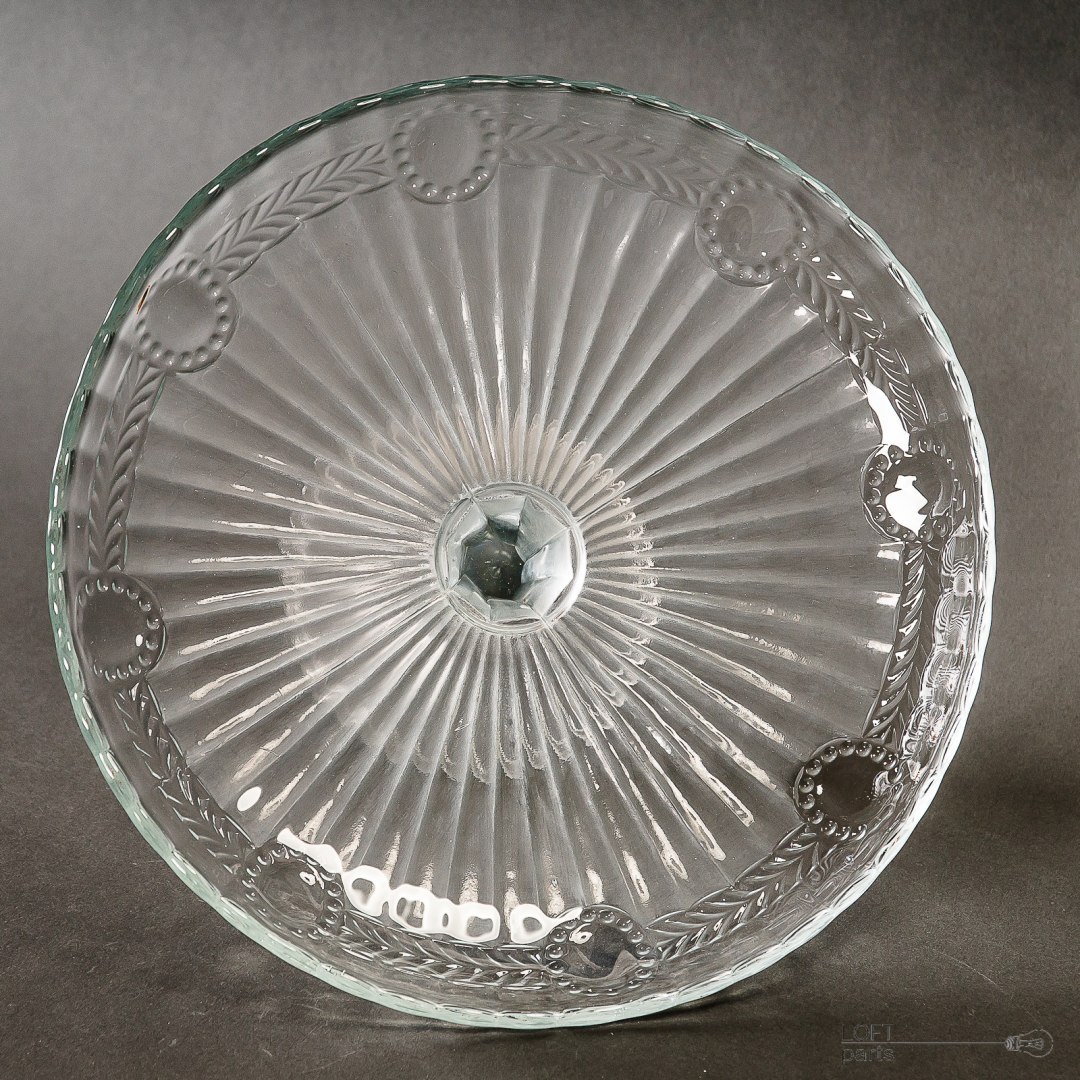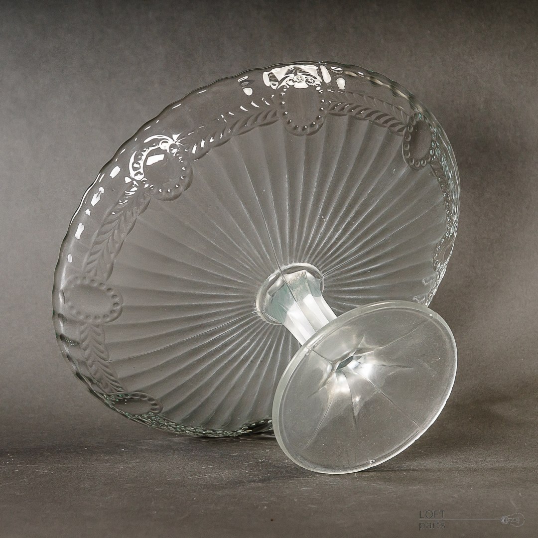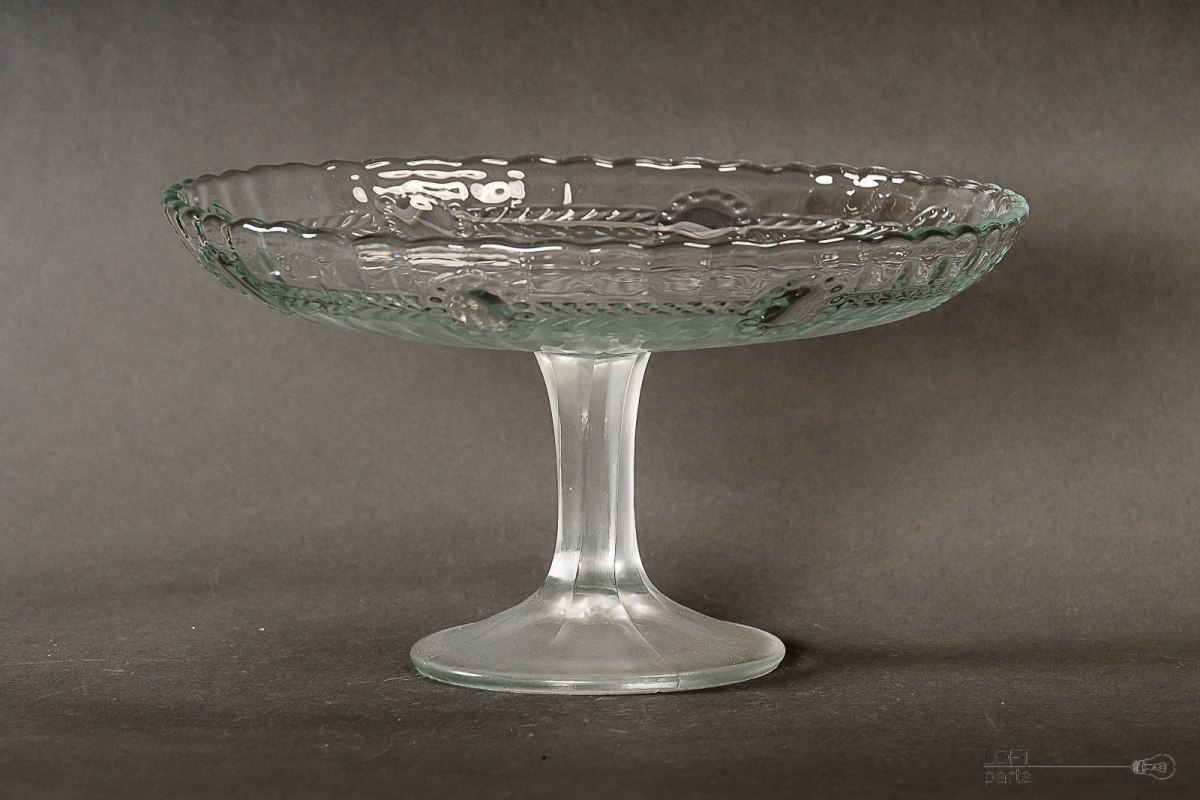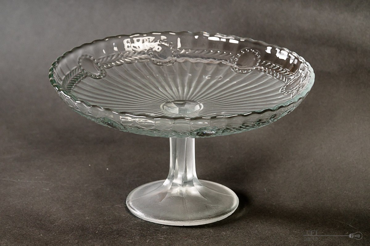 Bezbarwna z matowaną nogą i częścią czaszy patera/owocarka ''Olivia''. Wyprodukowana w Hucie Szkła Gospodarczego Ząbkowice.