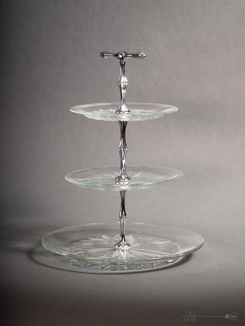 Colourless multi-storey cake stand "Pyramid" produced in the Ząbkowice Household Glass Glassworks. In the catalogue of the glassworks it bears the number 17-579/1.