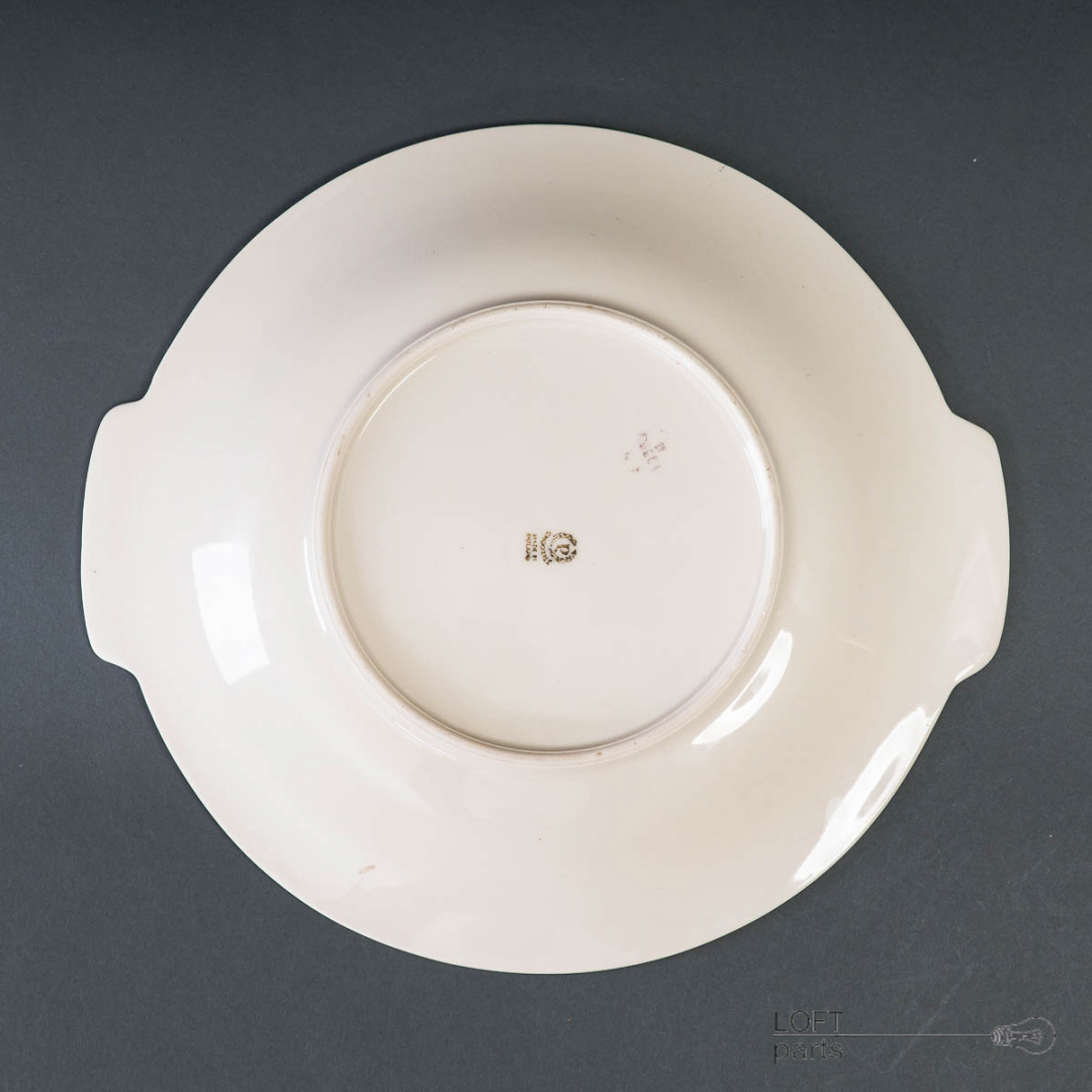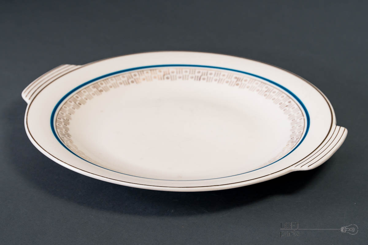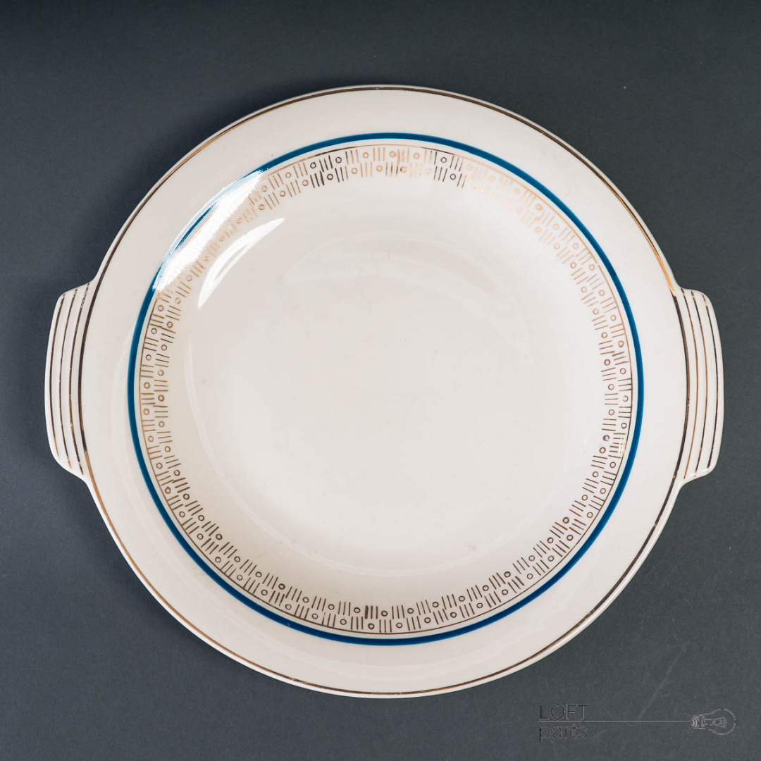 Biała z niebiesko-złotą geometryczną dekoracją patera wyprodukowana przez Porcelanę Chodzież.