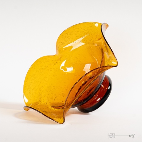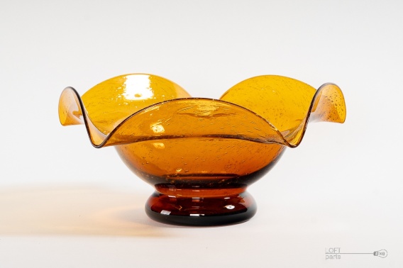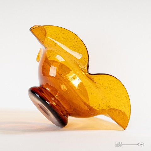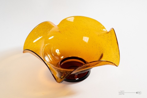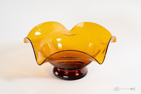Miodowa patera ''Silesia Rustica'' zaprojektowana przez Ludwika Fiedorowicza. Wyprodukowana w Hucie Szkła Gospodarczego Ząbkowice. Szkło antico.