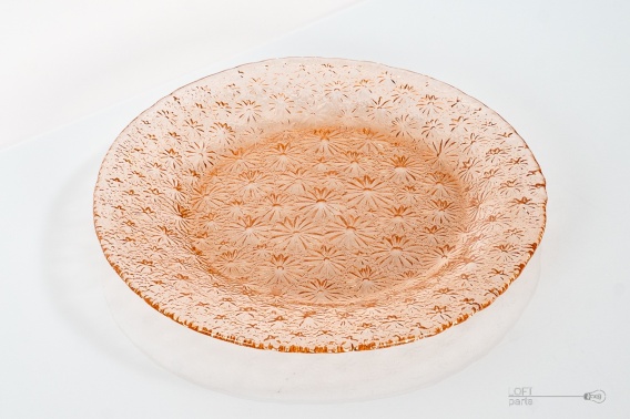 Rozalinowa patera ''Stokrotki'' zaprojektowana przez Ludwika Fiedorowicza. Wyprodukowana w Hucie Szkła Gospodarczego Ząbkowice.