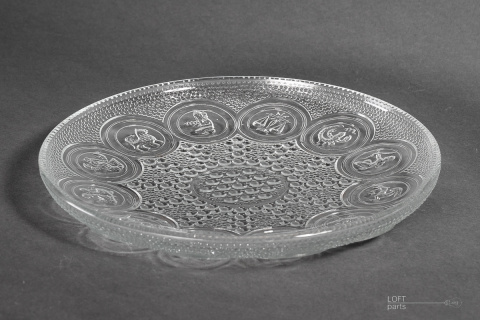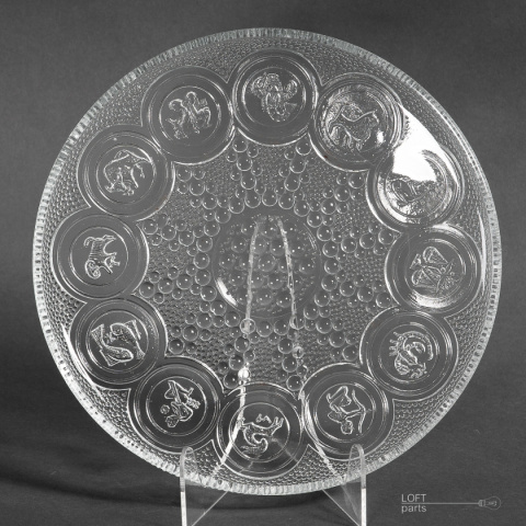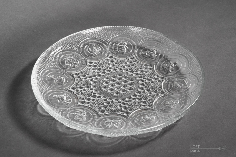 Colourless ''Zodiac'' platter designed by Eryka Trzewik-Drost. Produced in the Ząbkowice Household Glassworks.
