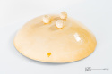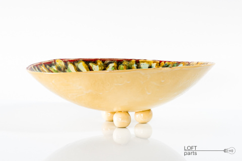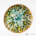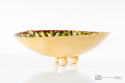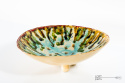 A colourful cake stand on legs. The plate is cracked, but without chipping.