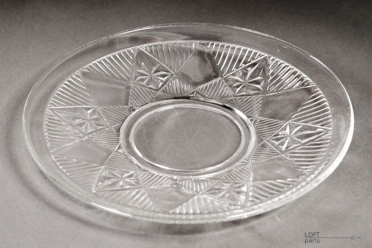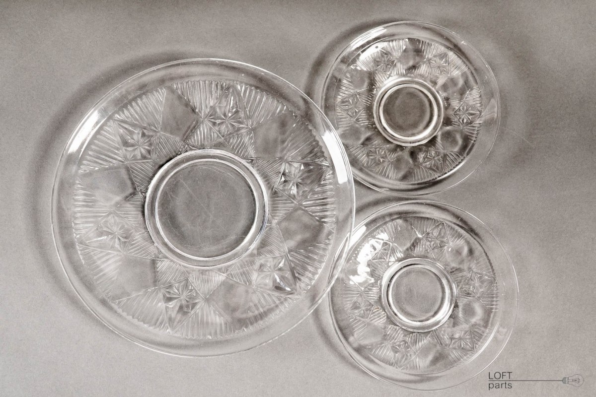 Colourless cake stand with two plates. Unfortunately, I don't know their origins. Abrasions and scratches on the upper surface.