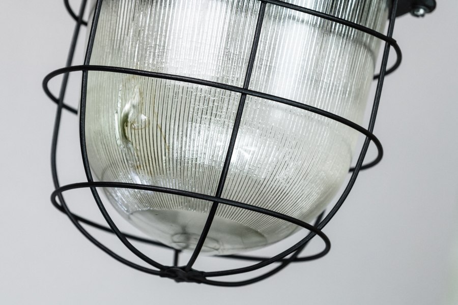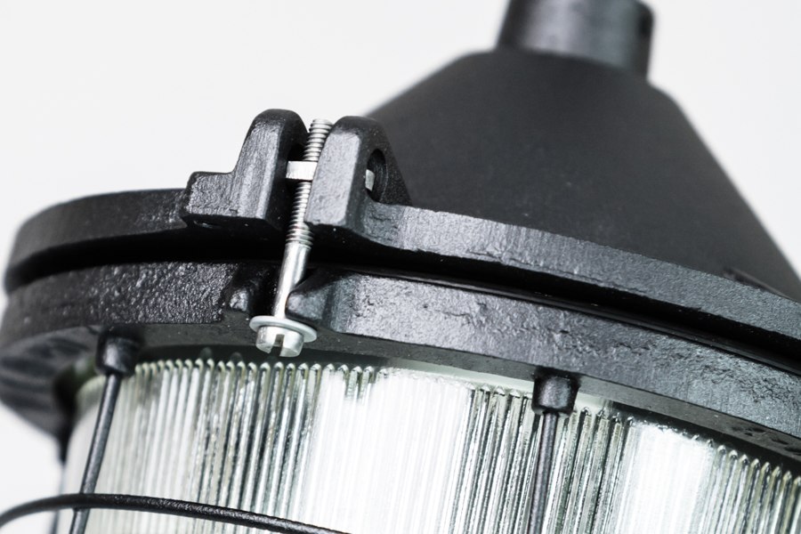 Żeliwna lampa wisząca w kolorze czarnym. Wyposażona w żarówkę. Z ryflowanym kloszem ładnie rozpraszającym światło.