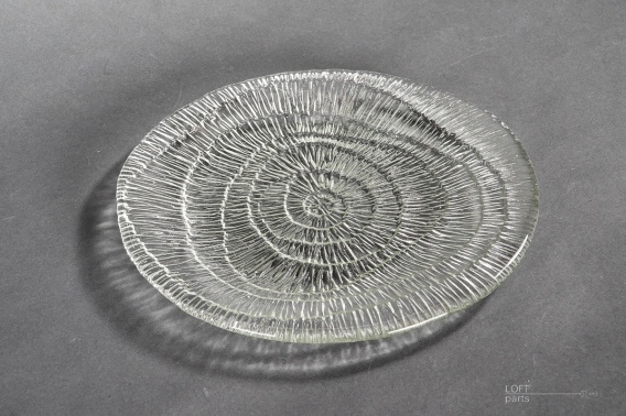 Bezbarwna patera ''Skamielina'' projektu Eryki Trzewik Drost. Wyprodukowana w Hucie Szkła Gospodarczego Ząbkowice.