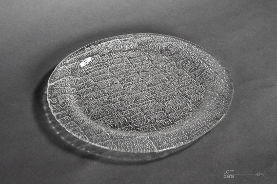 Bezbarwna patera ''Igloo'' zaprojektowana przez Erykę Trzewik-Drost, a wyprodukowana w Hucie Szkła Gospodarczego Ząbkowice.