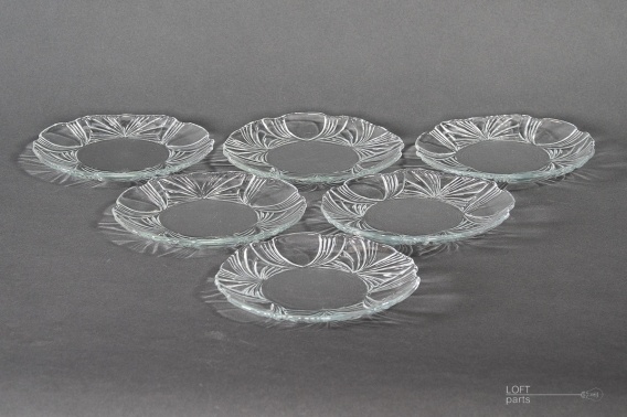 A set of six colourless ''Fany'' plates produced in the Ząbkowice Household Glassworks.