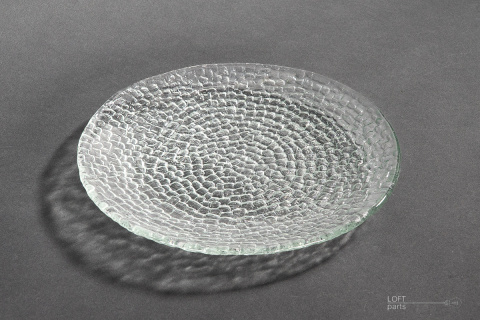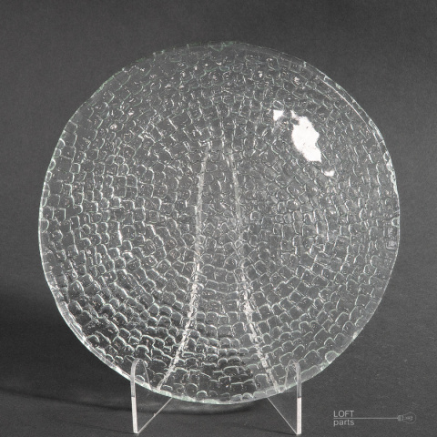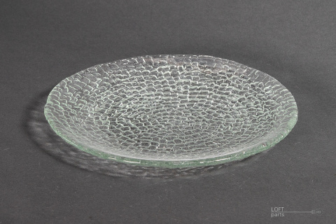 Bezbarwna patera ''Bruk'' zaprojektowana przez Ryszarda Serwickiego. Wyprodukowana w Hucie Szkła Gospodarczego Ząbkowice.