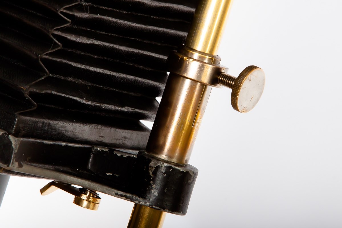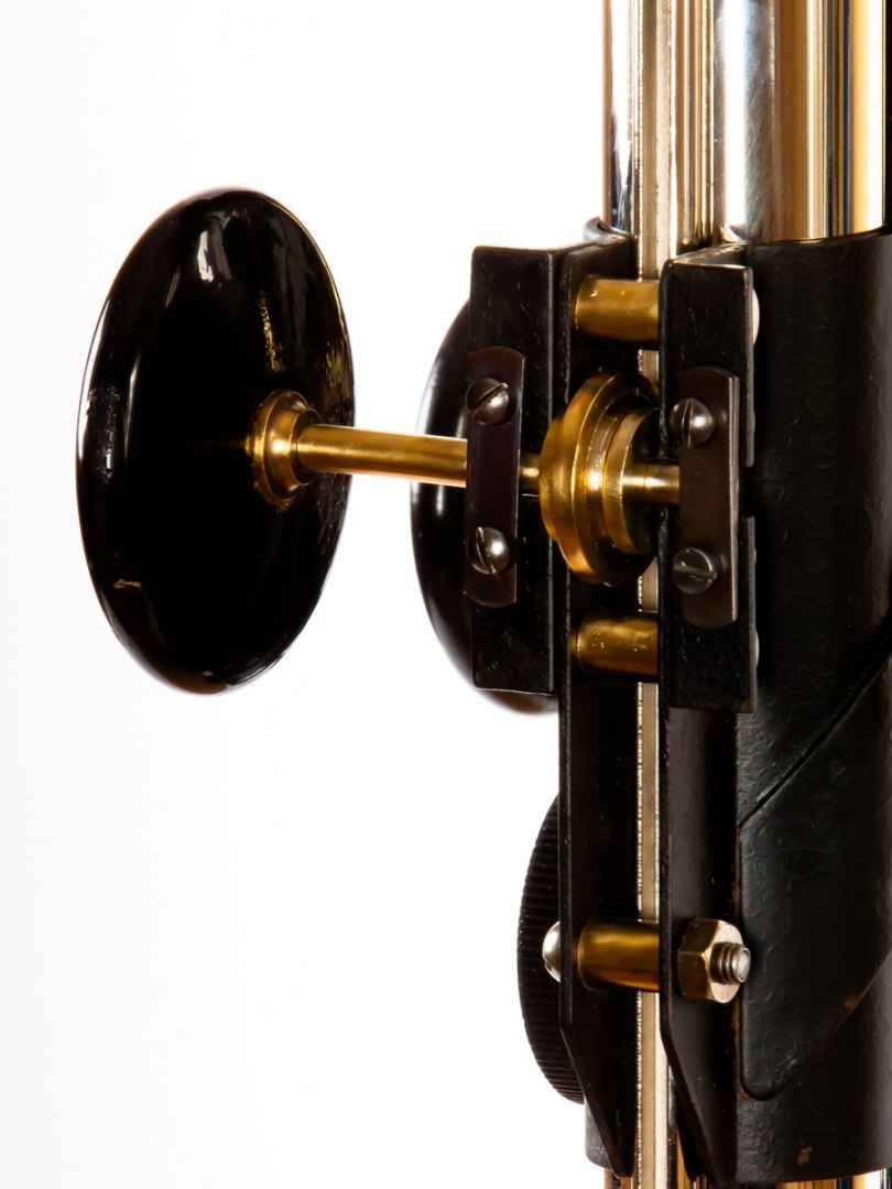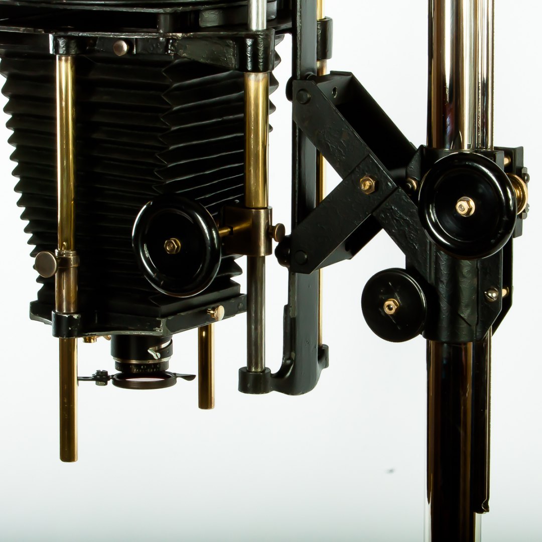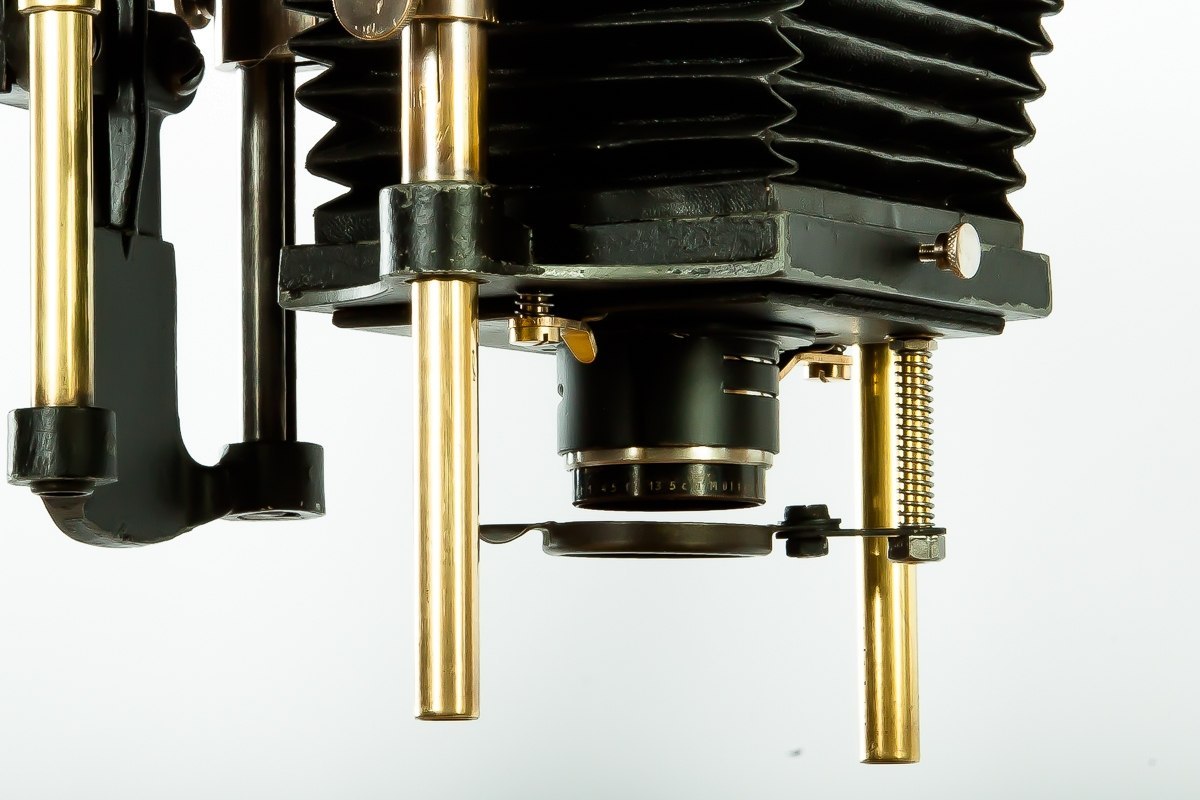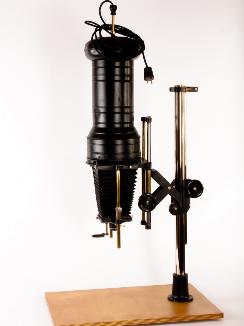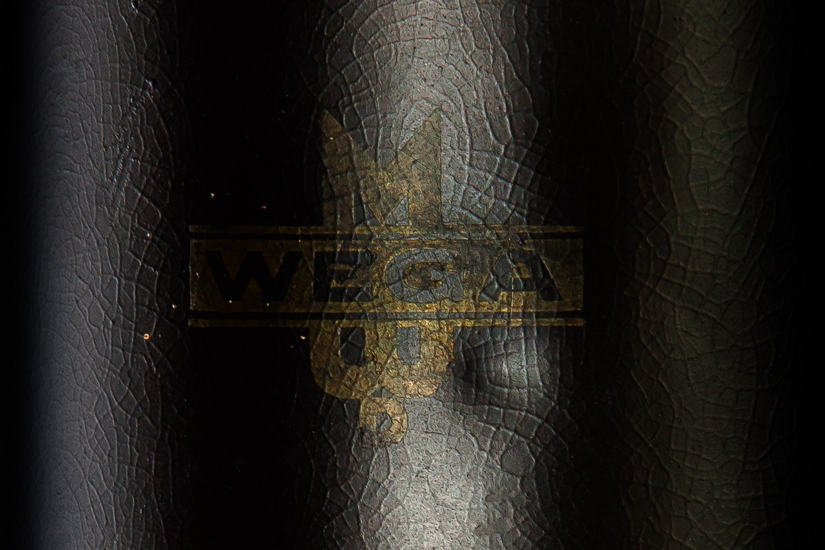 Powiększalnik Wega firmy Muller u. Wetzig Dresden Spezial Fabrik. Firma powstała w 1899 roku a sam powiększalnik prawdopodobnie został wyprodukowany w latach dwudziestych XX wieku. Niestety nie udało mi się znaleźć konkretnych informacji na temat tego akurat modelu. Wydaje mi się że jest unikatowy. Jest bardzo duży (nie widziałem nigdy większego) i bardzo ciekawie i precyzyjnie zbudowany. Ma piękne mosiężne detale, które pomimo wieku prezentują się i działają świetnie. Stan w którym teraz jest wymagał mnóstwa pracy i cierpliwości. Ale efekt przeszedł moje najśmielsze oczekiwania. Prezentuje się wspaniale i może stać się ozdobą każdego wnętrza, szczególnie urządzonego w stylu industrialnym. Jest zachowany w stanie oryginalnym poza podstawą (zrobiłem nową własnoręcznie) i przewodem zasilającym (zastosowałem przewód w oplocie i starą bakelitową wtyczkę). Odnowiłem tez rurę nośną (statyw). Została poniklowana czyli przywrócona do oryginalnego pokrycia. Poza tym wszystkie części, pokrętła, obiektyw, mieszek, obudowa i cała reszta są oryginalne.