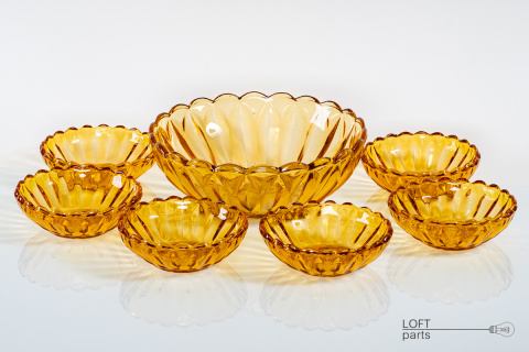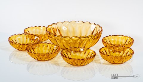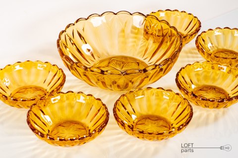 Zestaw 6+1 miodowych salaterek wyprodukowany w Hucie Szkła Gospodarczego Ząbkowice.