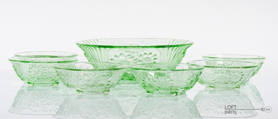 Zielony zestaw sałatkowy składający się z misy i sześciu salaterek. Niestety nie znam jego pochodzenia.