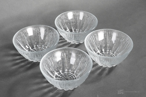 Komplet czterech bezbarwnych salaterek ''Cora'' zaprojektowanych przez Erykę Trzewik-Drost. Wyprodukowane Hucie Szkła Gospodarczego Ząbkowice.