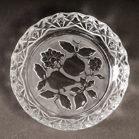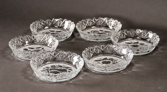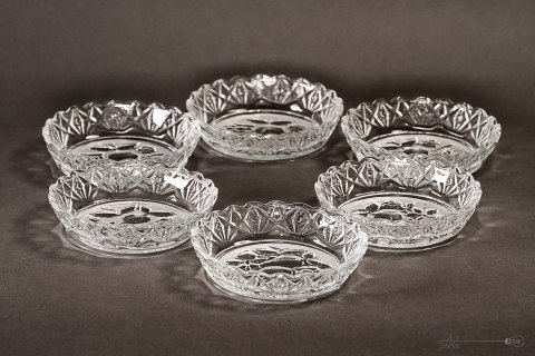 Komplet sześciu bezbarwnych salaterek wyprodukowanych w Hucie Szkła Gospodarczego Hortensja. W katalogu huty noszą numer 367.