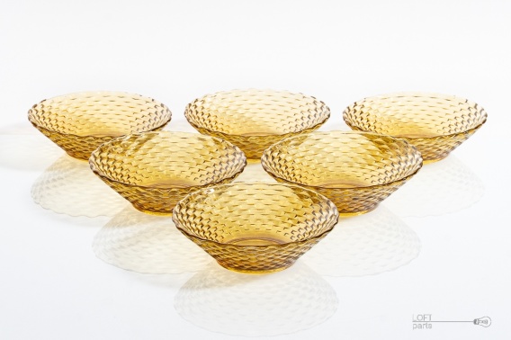 Komplet sześciu miodowych salaterek wyprodukowanych w Hucie Szkła Prądniczanka.