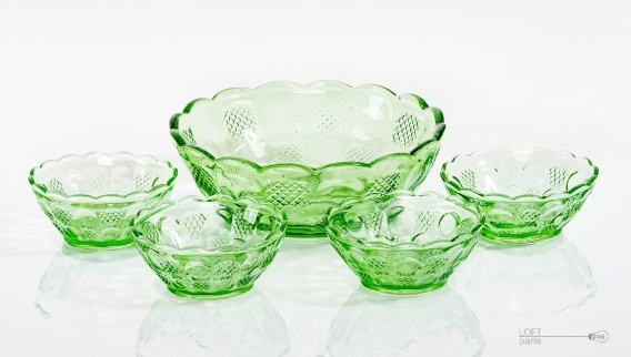 Komplet zielonych salaterek ''Oliwki'' składający się z jednej dużej i czterech małych salaterek. Wyprodukowany w Hucie Szkła Gospodarczego Ząbkowice.