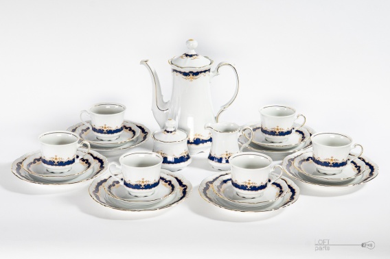 Serwis do kawy składający się z dzbanka, sześciu filiżanek ze spodkami, sześciu talerzyków deserowych, cukiernicy oraz mlecznika wyprodukowany przez Mitterteich Porzellan Bavaria.