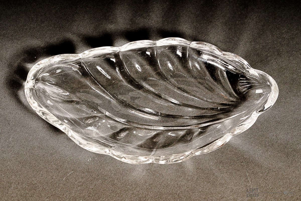 Bezbarwna patera śledziówka wyprodukowana w Hucie Szkła Gospodarczego Ząbkowice.