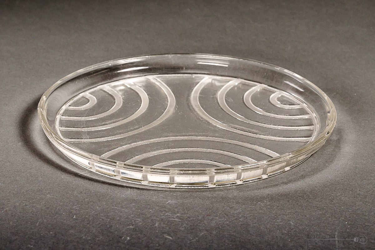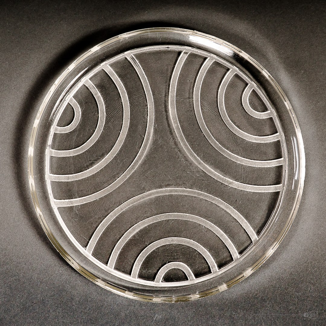 Bezbarwna tacka pod karafkę i kieliszki wyprodukowana w Hucie Szkła Gospodarczego Hortensja.