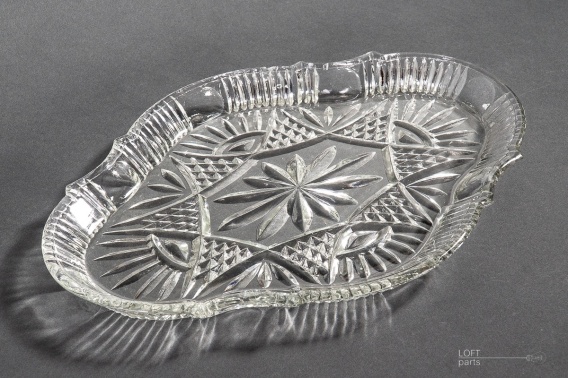 A colourless tray produced in the Ząbkowice Household Glassworks. In the catalogue of the glasswork, it is numbered 2420. The tray has a small chip on the edge (visible in the photo).