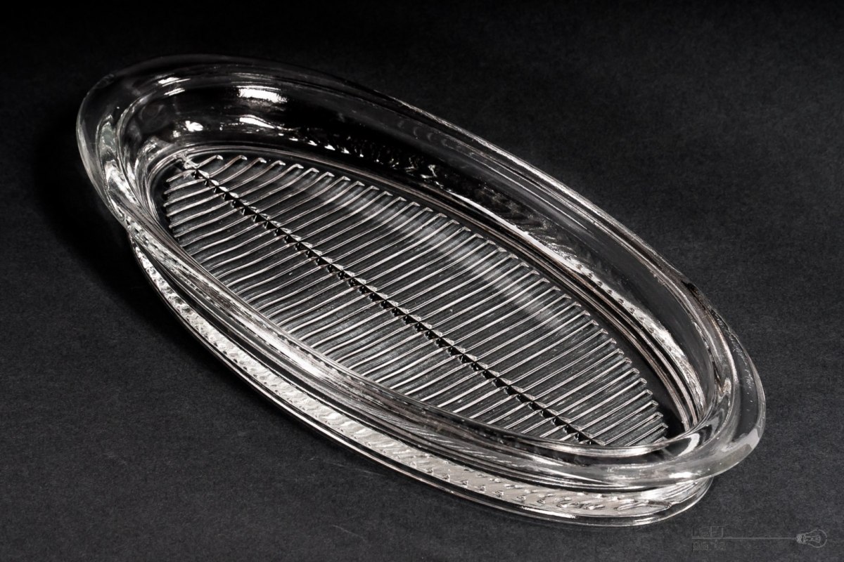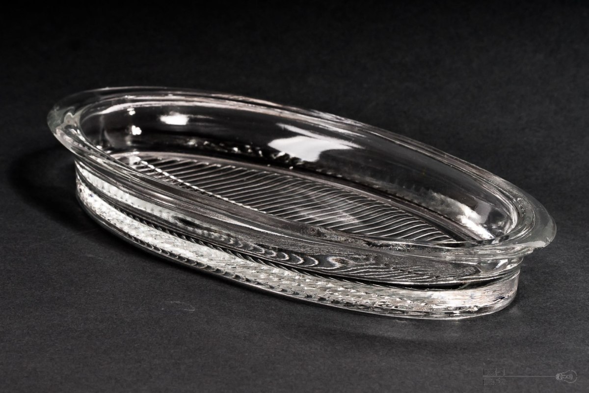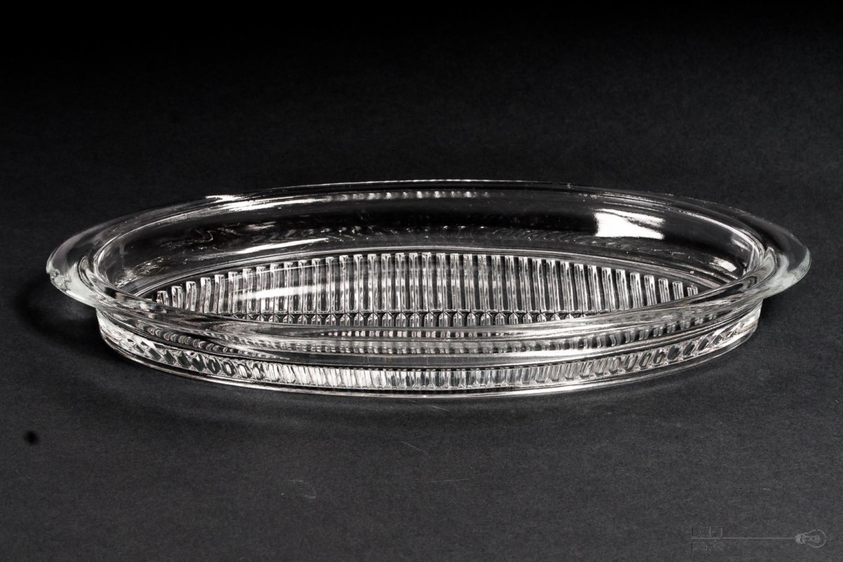 Owalna bezbarwna tacka z ryflowanym spodem. Niestety nie znam jej pochodzenia. Ma mały uszczerbek na górnej krawędzi.