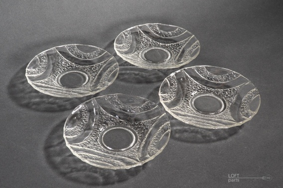 Komplet czterech bezbarwnych talerzyków w stylu Art Deco wyprodukowany w Hucie Szkła Gospodarczego Hortensja. W katalogu huty noszą numer 393.