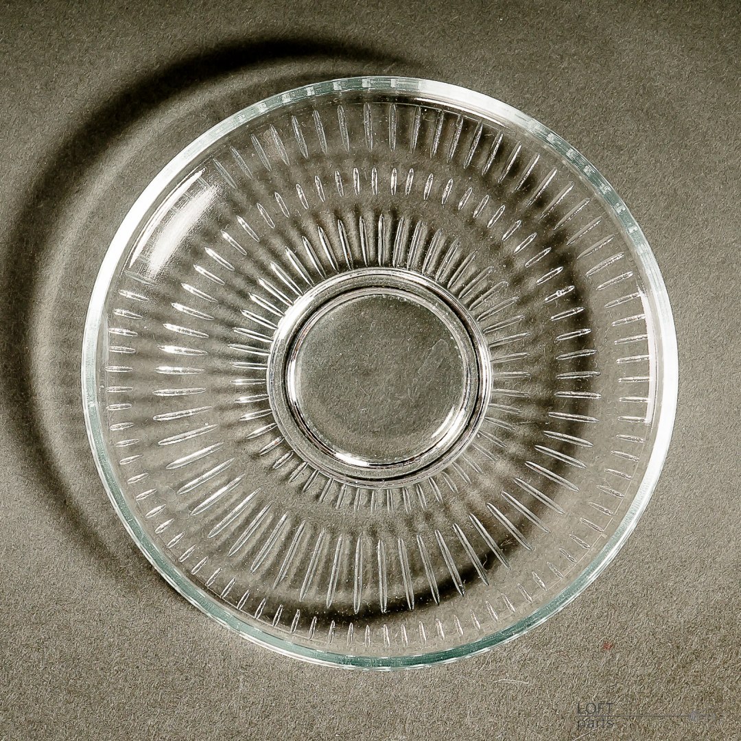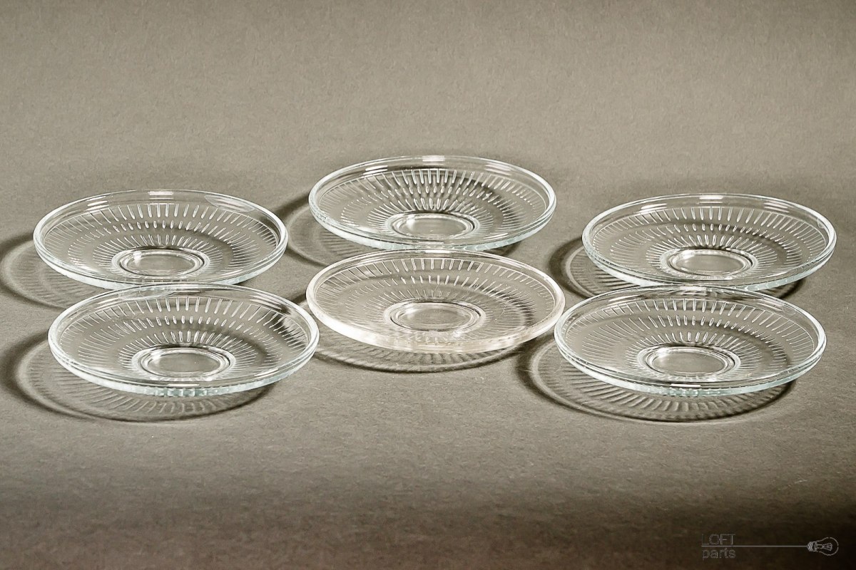 Komplet sześciu bezbarwnych talerzyków z prostym, geometrycznym motywem. Niestety nie znam ich pochodzenia.